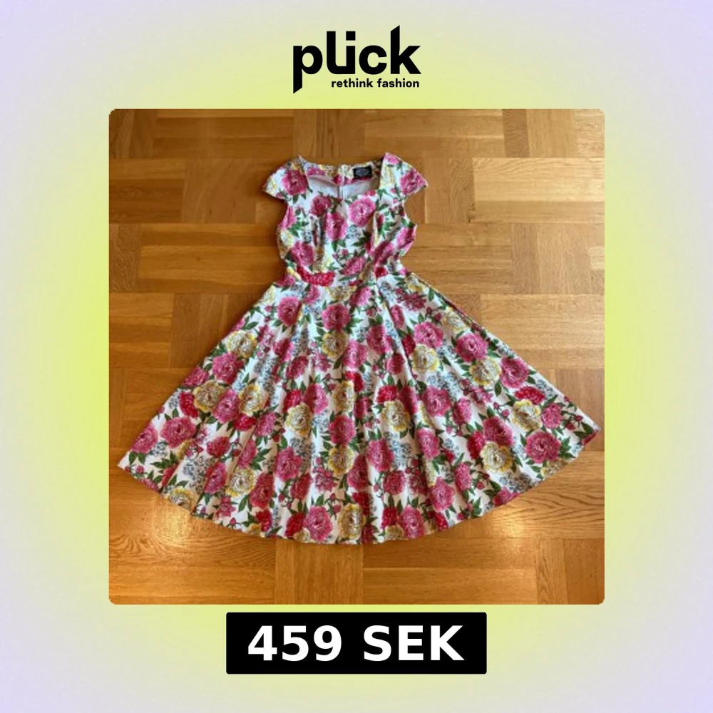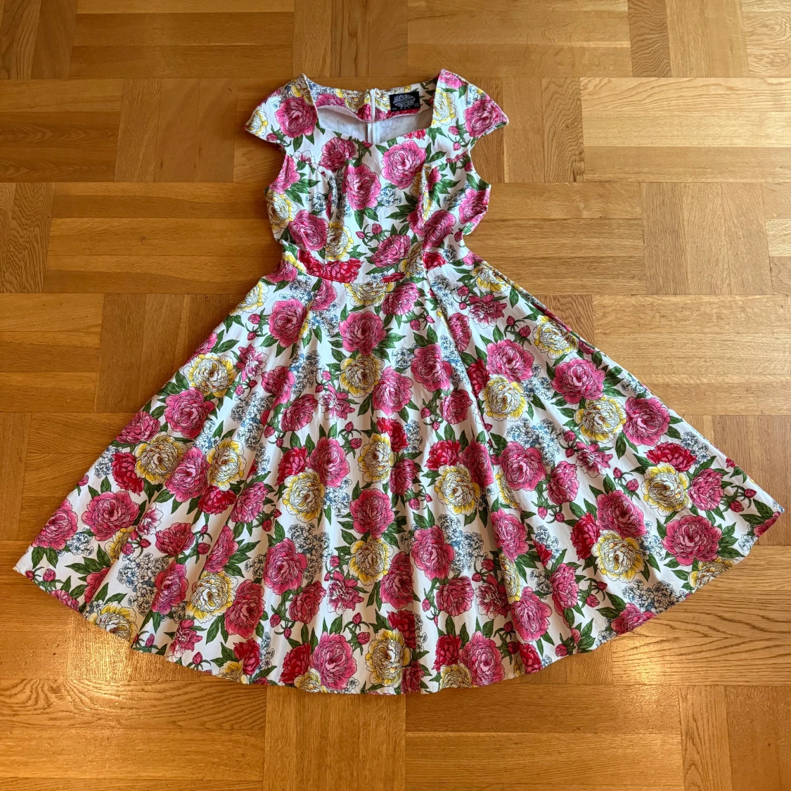 Superfin långklänning från H&R London med färgglatt blommönster i rosa, rött, gult och grönt på vit botten. Klänningen har korta ärmar, markerad midja och vidd i kjolen. Perfekt för sommarens alla tillfällen! Strl EU 38.
