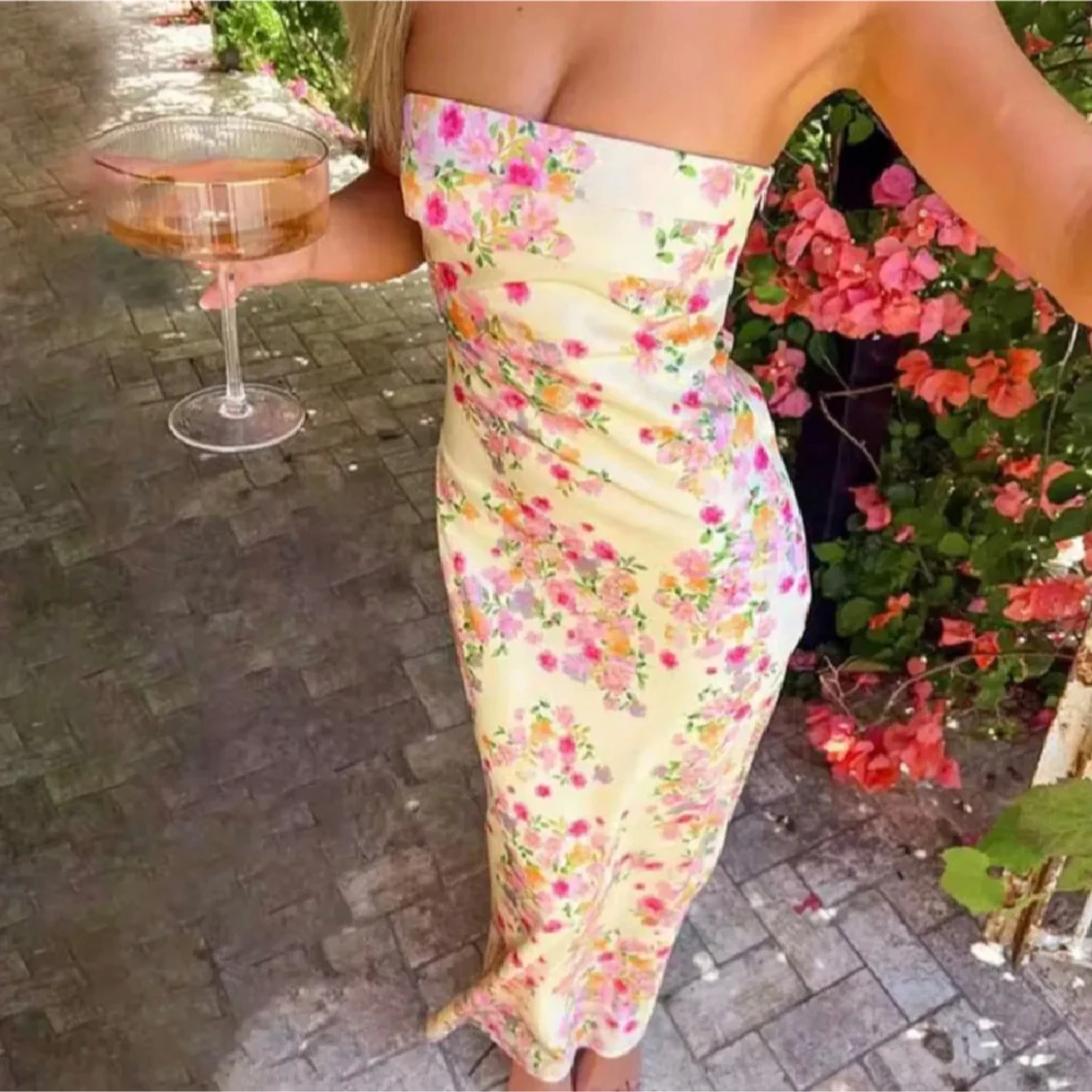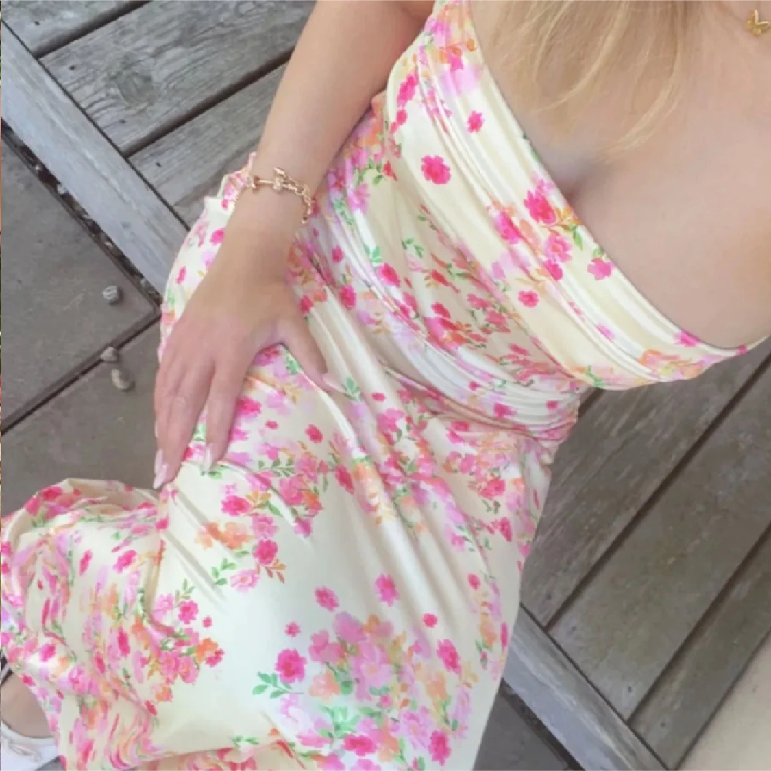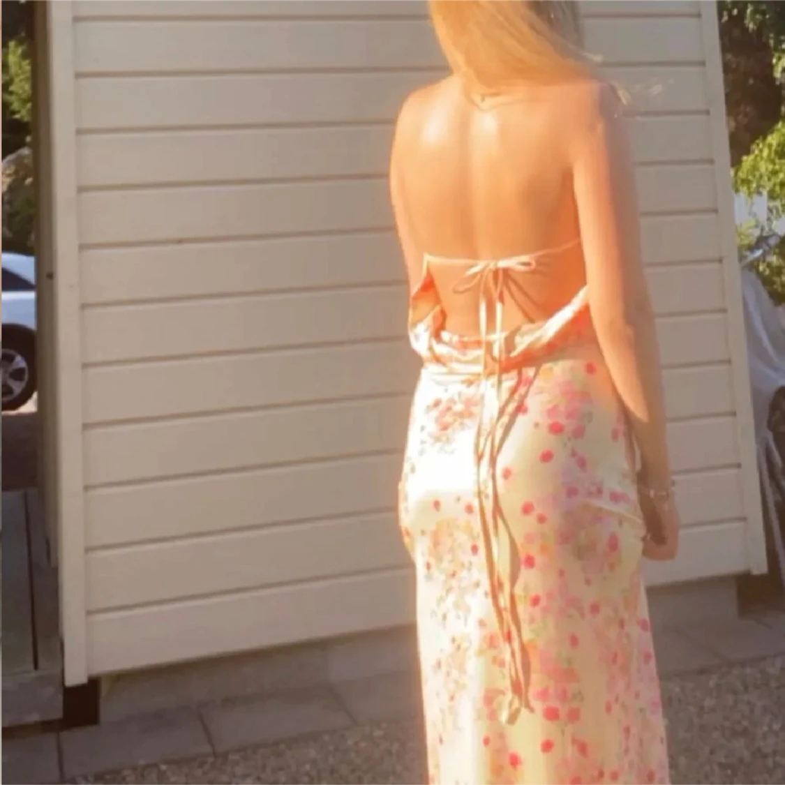 Superfin långklänning i ljus i champagnefärgad ton med blommigt mönster i rosa, orange och grönt. 💗