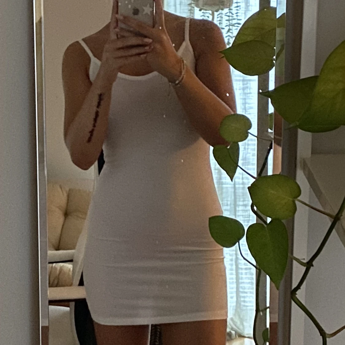 En fin vit klänning som är för kort på mig vilket är varför den inte kommit till användning!🩷lite genomskinlig så tips att använda hudfärgade underkläder! ☺️(säljer en i marinblå)