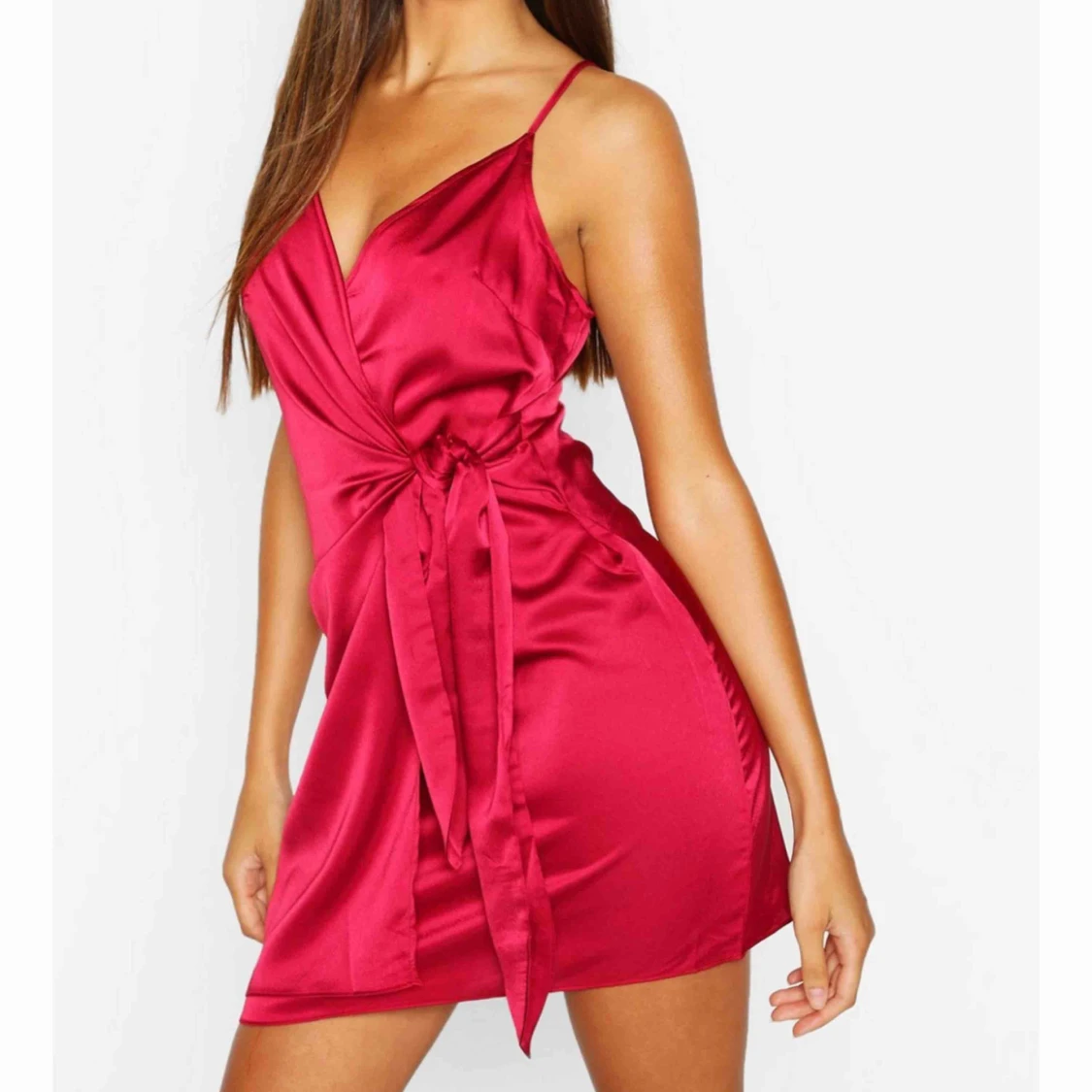 Klänningen är i materialet silke. Iaf så det känns. Dragkedja i ryggen, och ändringsbara axelband. Säljer den för att jag tycker den är en aning för kort för mig. Den är i storlek 40, men skulle säga att den mer är den 36/38. Använt den 1 gång.