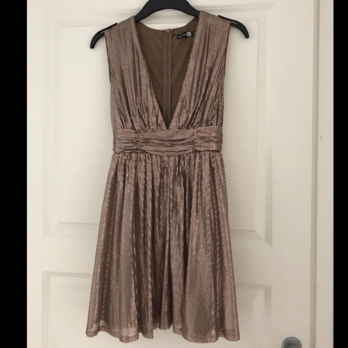 Aldrig använd klänning från Boohoo täckt i paljetter. Djupt urringad, hög i ryggen. Perfekt för fest eller nyår. Kan träffas i Täby, Stockholm city eller SU. Vid frakt får köparen stå för det :)