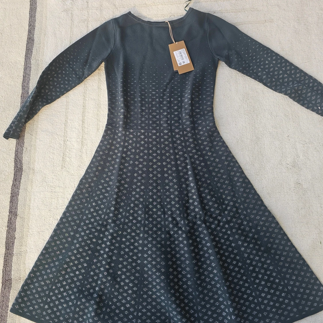 Supersnygg långklänning från BOSS i mörkgrönt med diskret mönster över hela klänningen. Klänningen har lång ärm, rund halsringning och en lätt utställd kjol. Materialet känns mjukt och följsamt, perfekt till högtider.