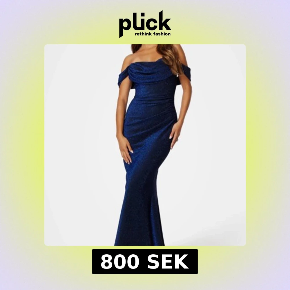 Säljer en marinblå långklänning med glittrigt tyg och offshoulder-design. Klänningen är figurnära. Har aldrig använt den. Anledning till att den säljes är på grund av fel storlek