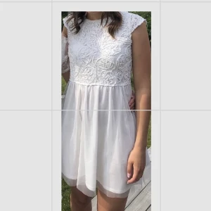 Ett jättefin vit sommarklänning från Bubbleroom. Den har en lagom urringning där bak och övre delen på klänningen är i ett jättefint spetsmönster. Klänningen är storlek 38 och är, enligt mig normal i storleken. Klänningen slutar lite ovanför knäna på mig (jag är 172 cm lång).