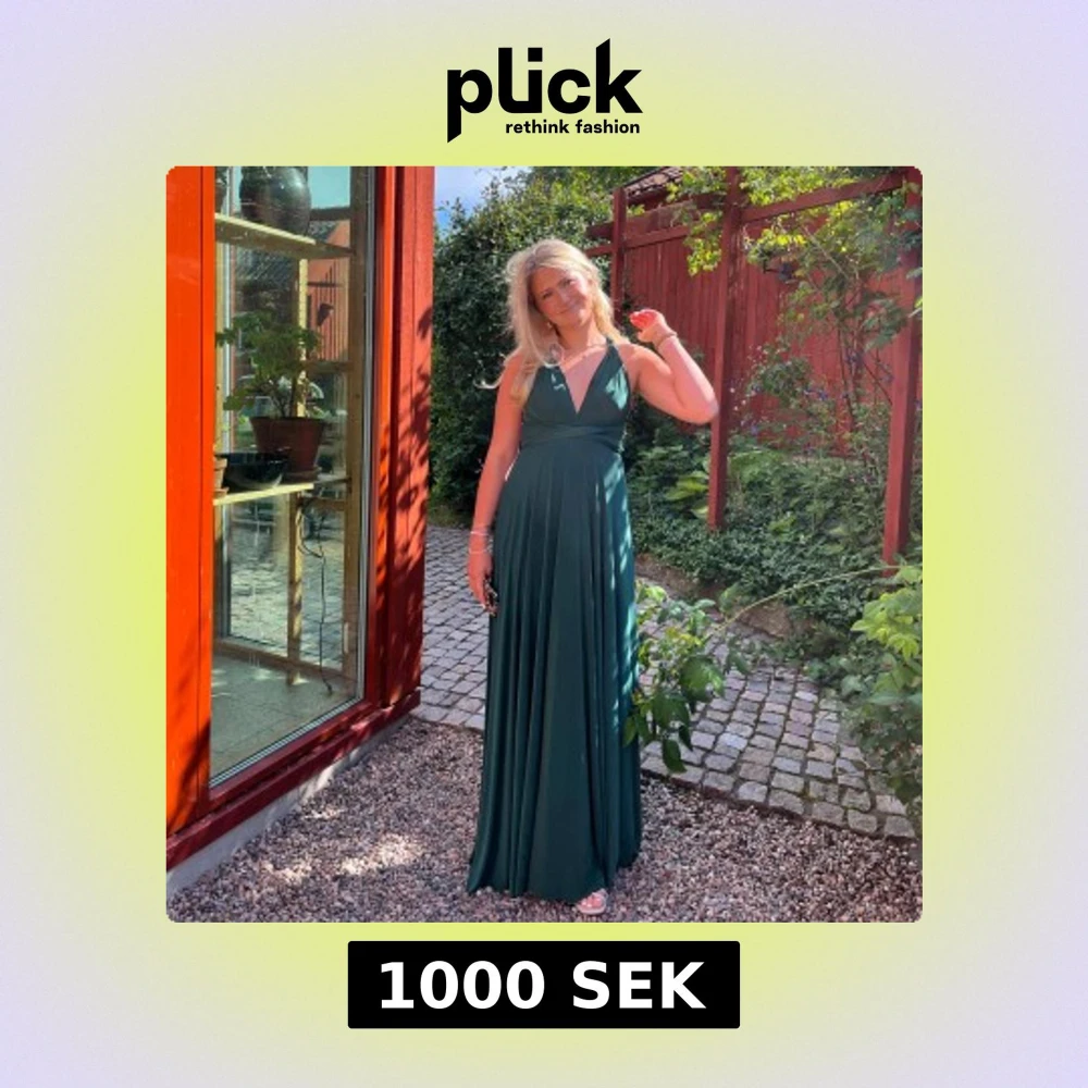 Mörkgrön långklänning från bubbleroom, man kan ändra banden så att klänningen sitter olika (titta hemsidan GODDIVA)