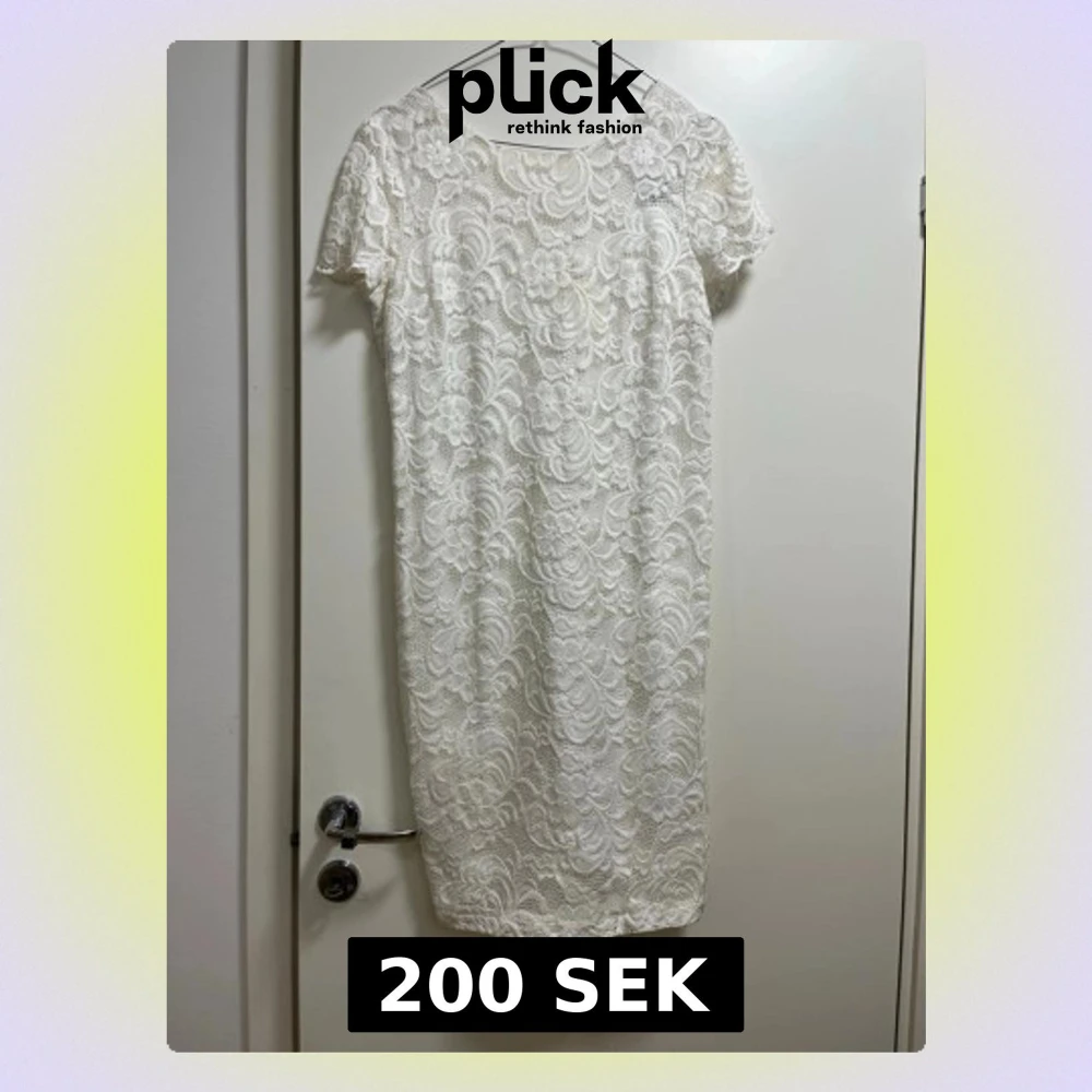 Säljer en elegant vit spetsklänning med korta ärmar och v-ringning i ryggen. Klänningen har ett vackert blommigt spetsmönster och är fodrad för extra komfort. Perfekt för sommarens alla tillfällen och studentfirande.