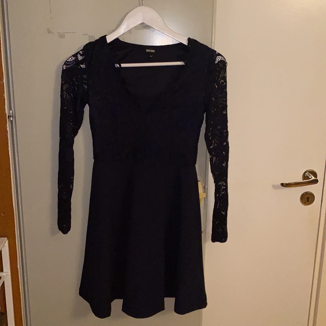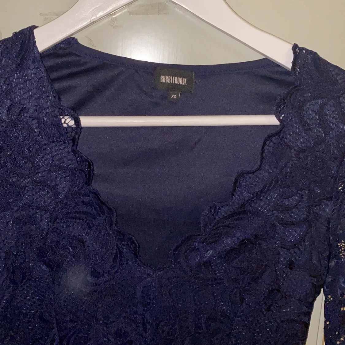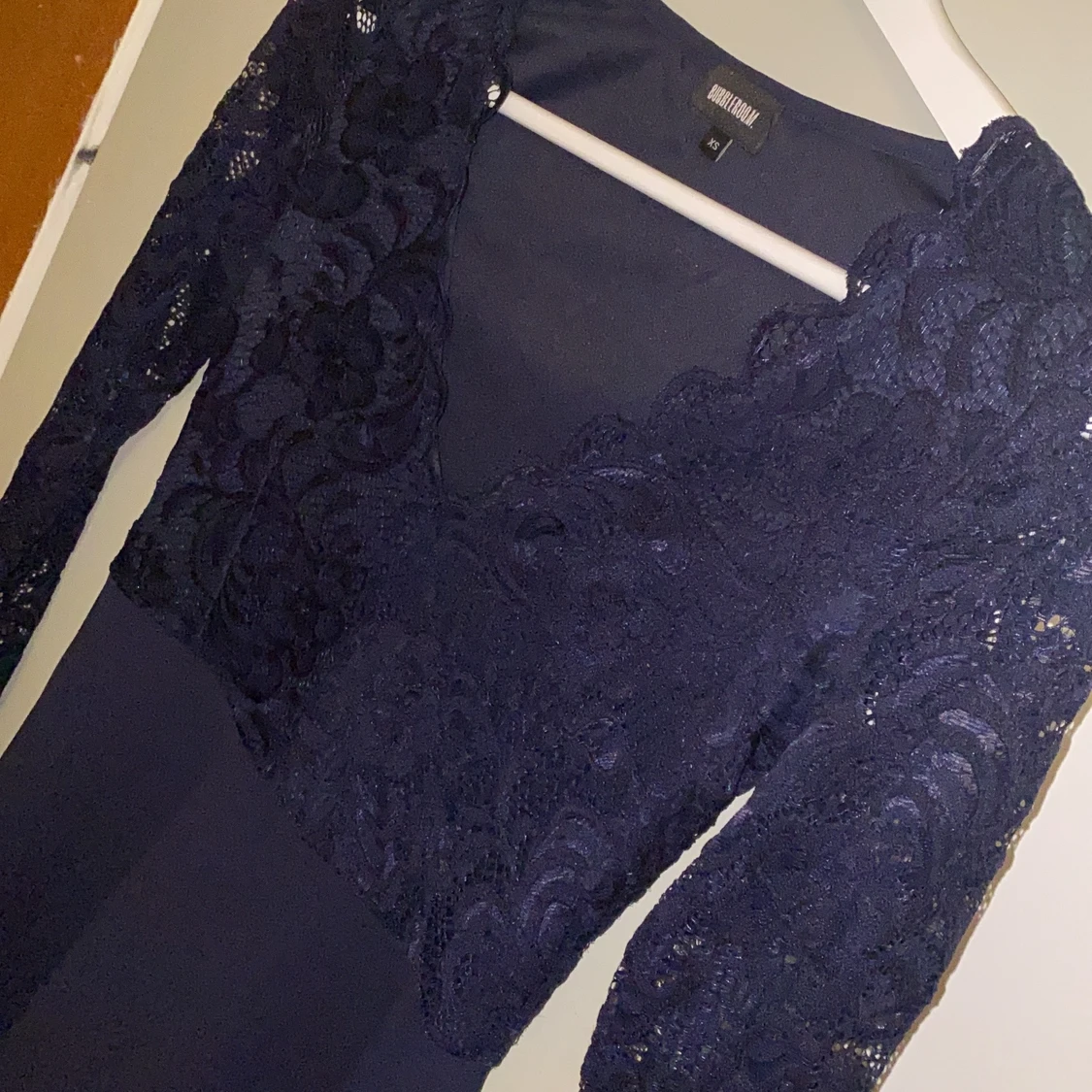 Spetsmönster på armarna och överdelen, kort klänning. Använd under ett tillfälle. Marinblå
