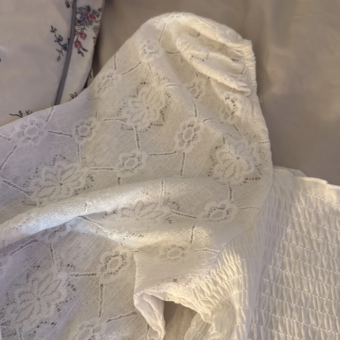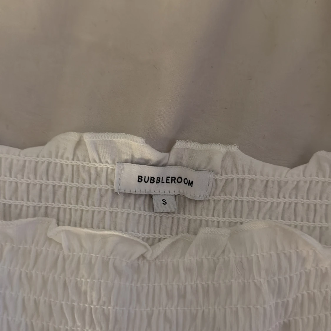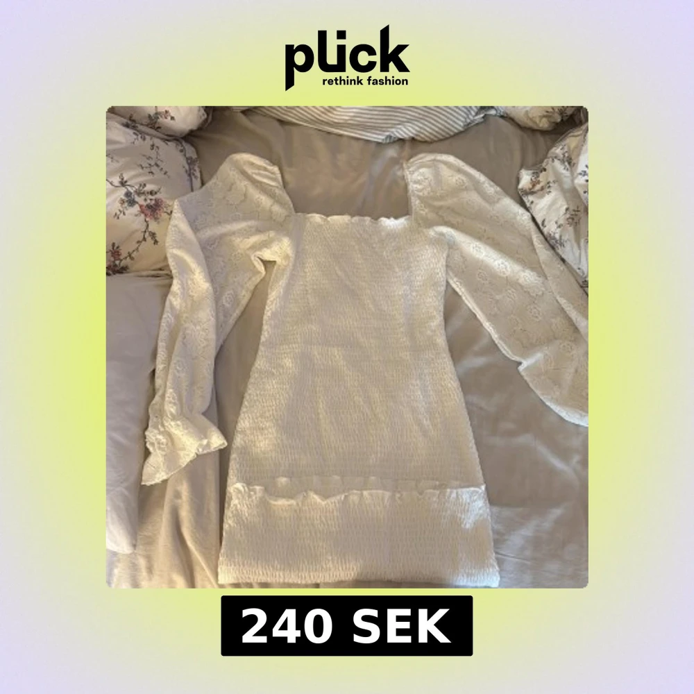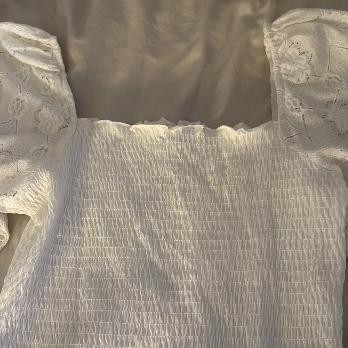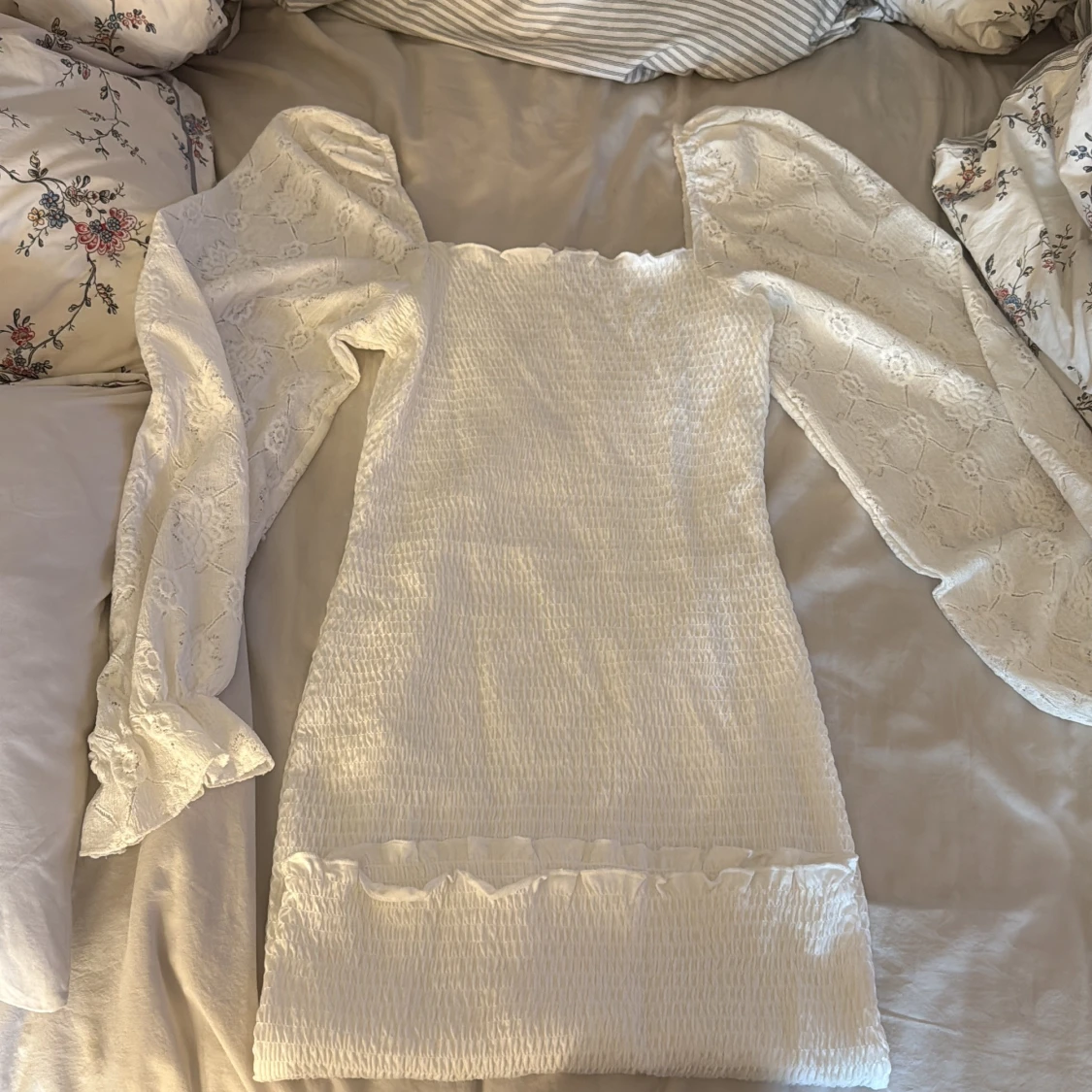 Supersöt vit kort klänning från Bubbleroom med puffiga långärmade spetsärmar och smockad kropp. Ärmarna har blommigt spetsmönster och klänningen har volangdetalj vid nederkanten. Perfekt för sommarens alla tillfällen!