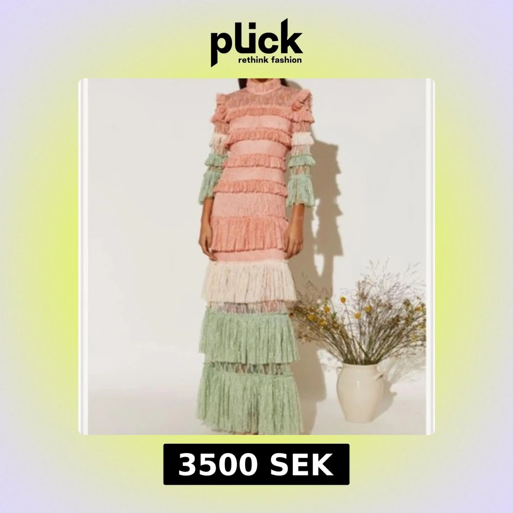 Superfin långklänning i pastellrosa, mintgrönt och vitt med volanger och spets. Klänningen har höga volangärmar, hög hals och flera lager med romantiska detaljer. Perfekt för dig som vill sticka ut med en unik och färgglad look.