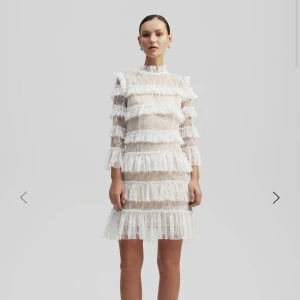 By malina carmine klänning / vit studentklänning / festklänning - Carmine klänning i spets med hög krage, långa ärmar och kort kjol täckt i volanger. PERFEKT INFÖR STUDENTEN😍 Endast använd 1 gång av mig på min student, helt felfri som man ser på bilderna, inga fläckar alls/ defekter, säljer då jag vill ha den i annan färg! (Det är jag på bilden är ca 159cm för referens) DETALJER:  miniklänning med spets-volang design och en tight passform , polokrage i spets & dragkedja längs ryggen.
