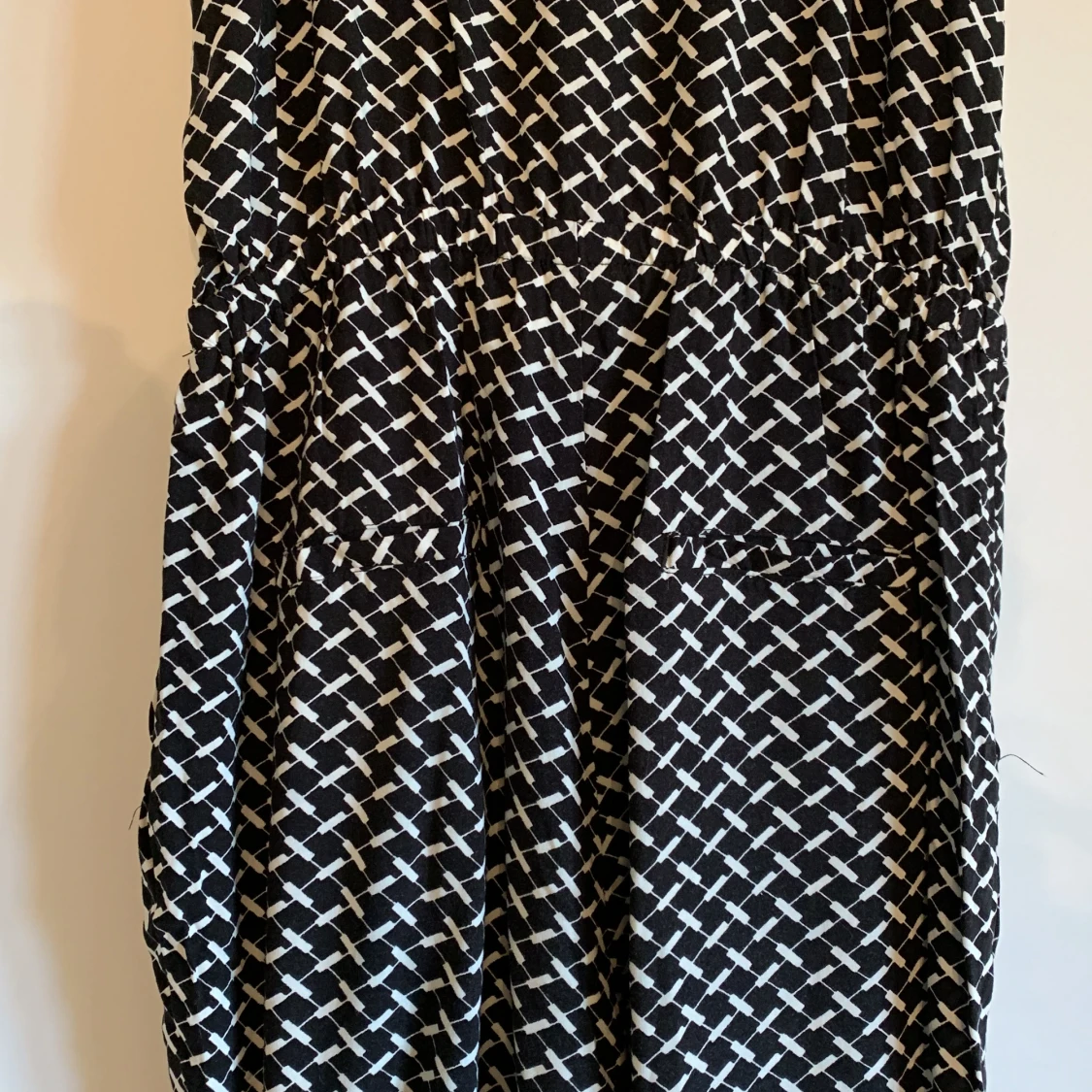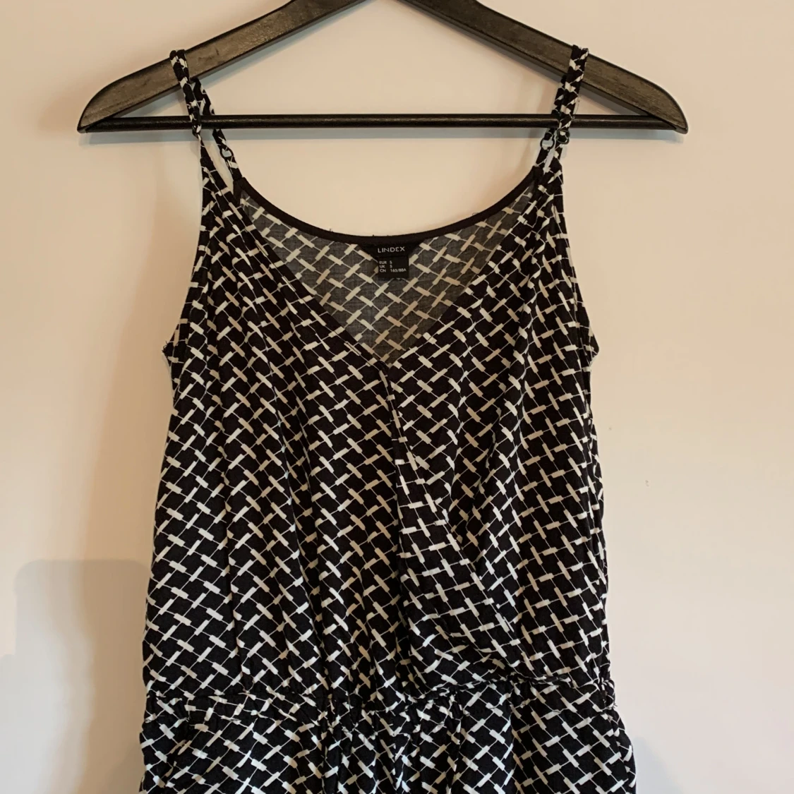 Mönstrad byxdress från Lindex. Justerbara axelremmar. Fickor på sidorna och sprättbara fickor där bak. En knapp vid v-ringen finns. Storlek S.