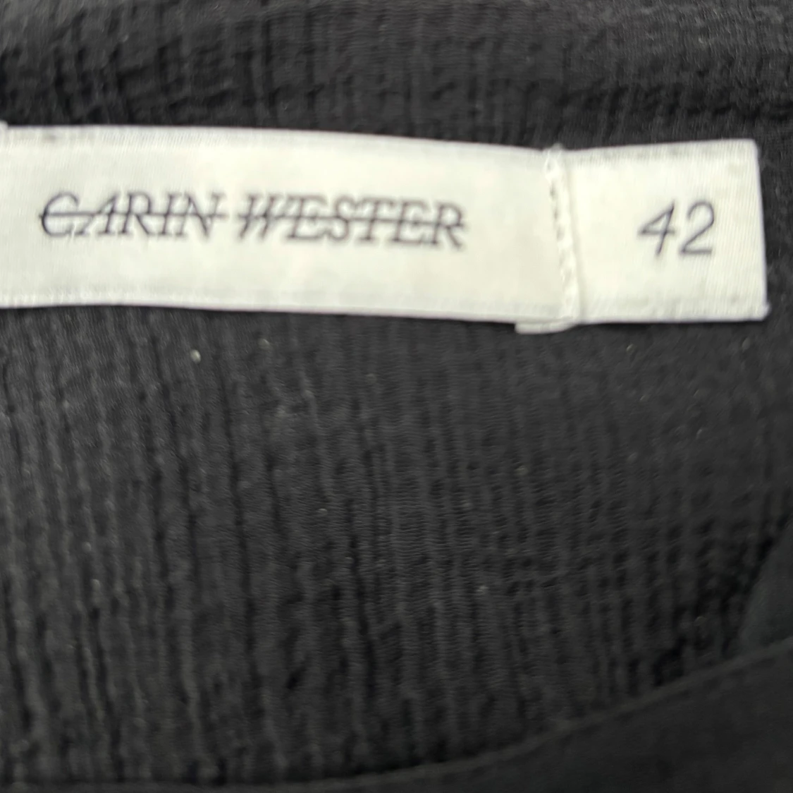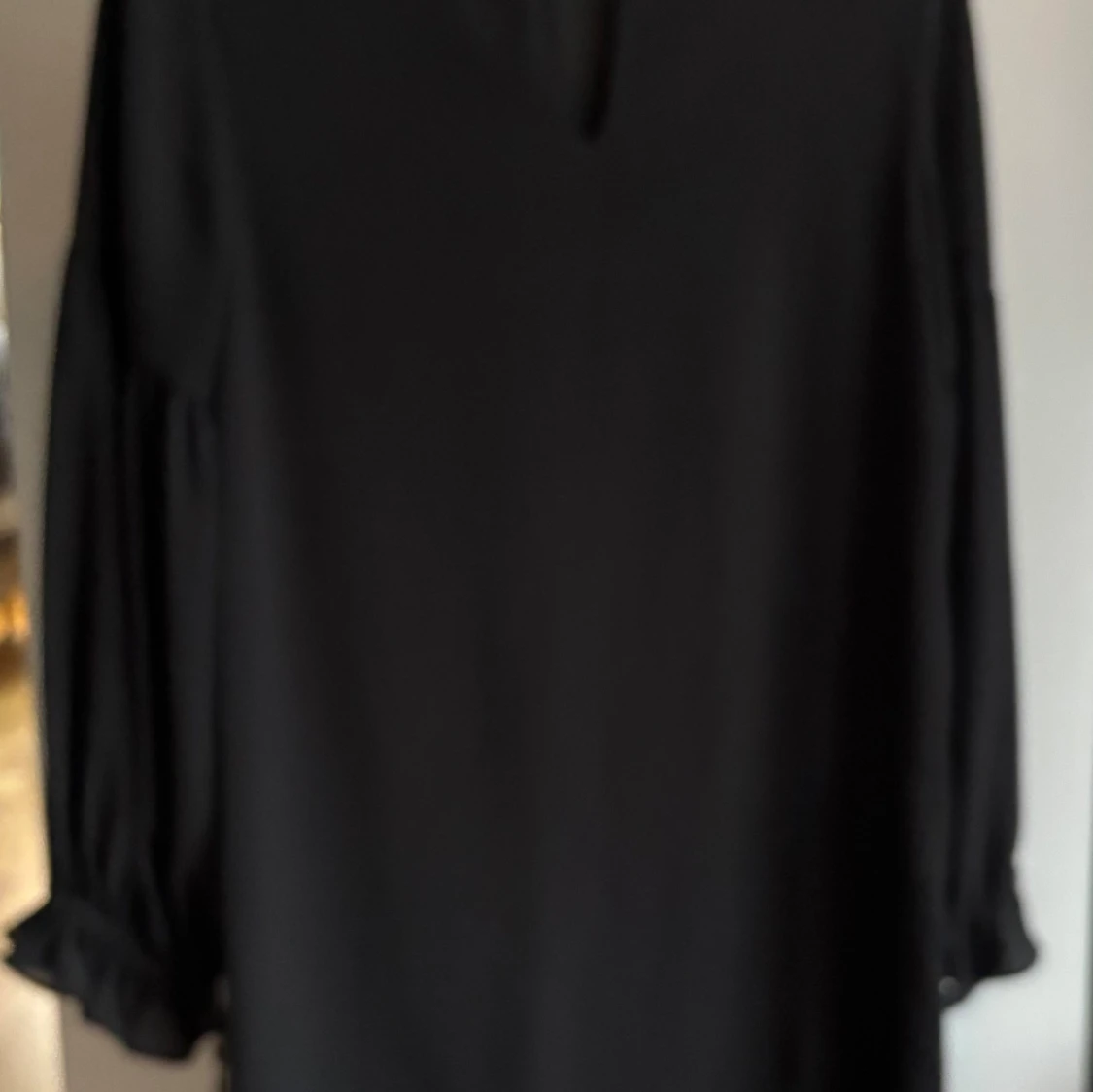 Svart klänning från Carin Wester i storlek 42. Modellen har långa, lätt puffade ärmar med diskreta volangdetaljer vid ärmslut. Klänningen är rak i modellen och har en enkel, stilren look som passar perfekt för dig som gillar minimalistisk stil.