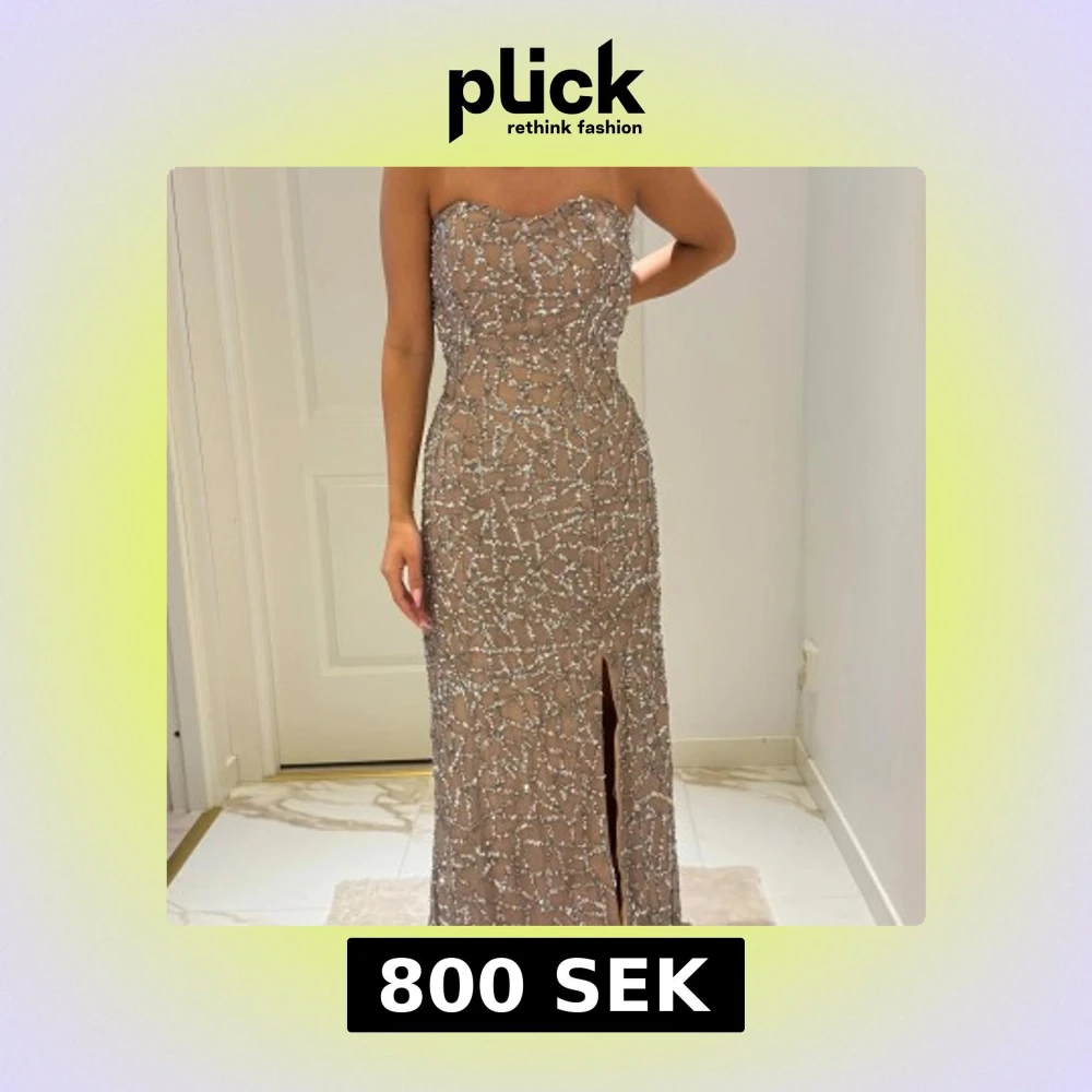 Snygg långklänning i champagnefärg med glittriga paljetter över hela klänningen. Axelbandslös modell med figurnära passform och slits framtill. Perfekt för bal eller fest. Dragkedja bak för enkel påklädning samt en insyd korsett!