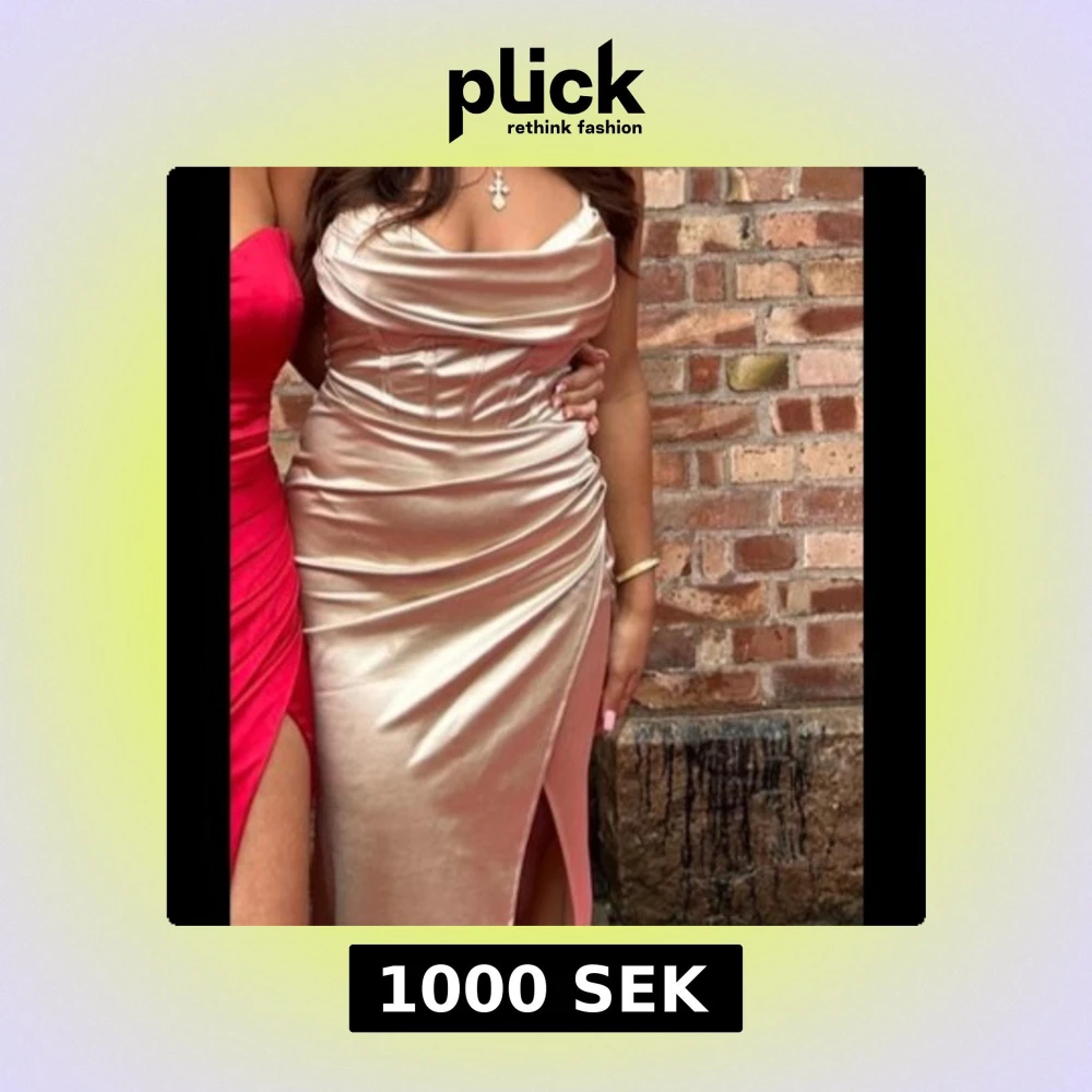 Elegant champagnefärgad långklänning med draperad överdel och smickrande passform. Klänningen har en stilren slits framtill och är perfekt för festliga tillfällen eller bal vilket är den enda gången jag använt den!