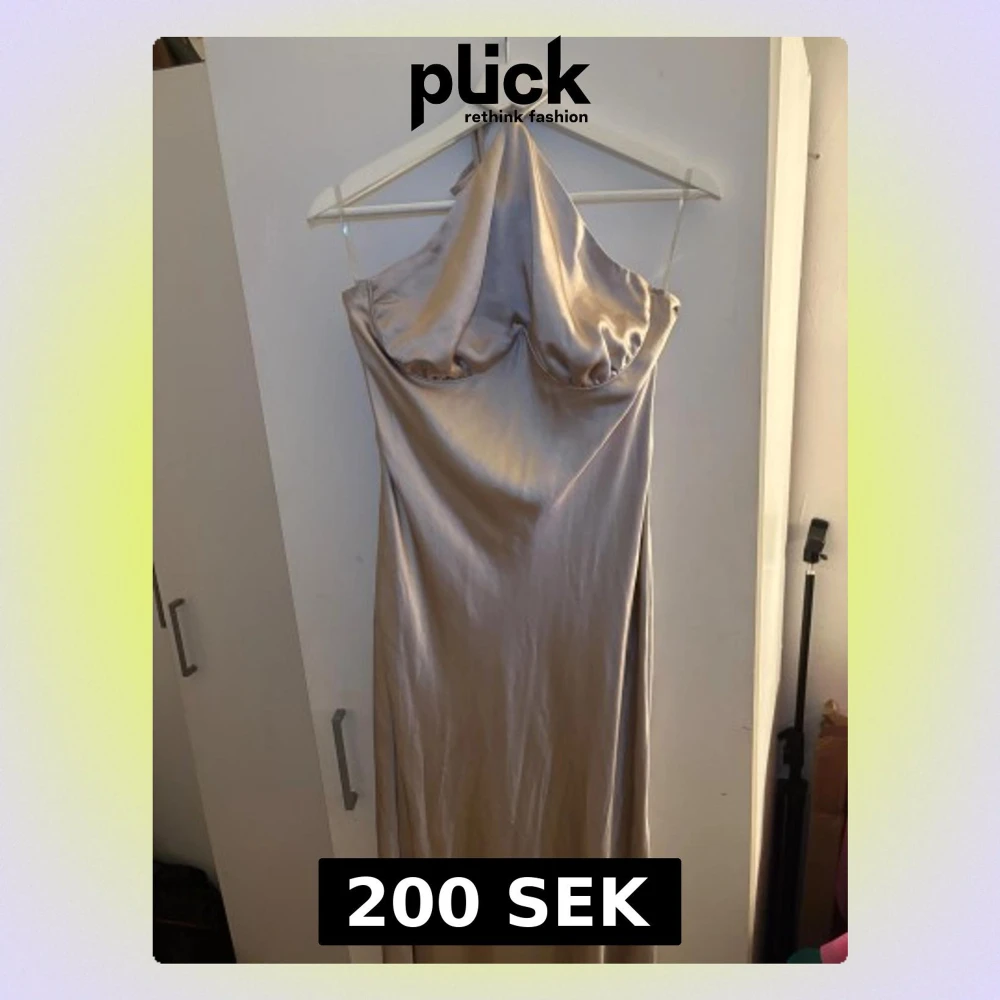 Snygg och elegant långklänning i champagnefärgad satin med halterneck och knyt i nacken. Klänningen har en slät, glansig yta och en mjuk, följsam passform som ger en lyxig känsla. Perfekt för dig som vill sticka ut med en stilren look och cool siluett.