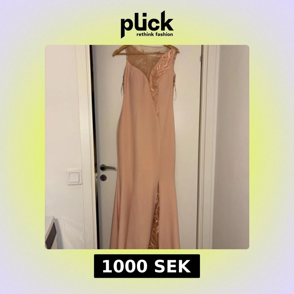 Säljer en elegant långklänning i champagnefärg med transparent mesh upptill och detaljerat broderi i samma ton. Klänningen har en v-ringad front, slits framtill och är ärmlös. Perfekt för bal, bröllop eller fest, med en lyxig och sofistikerad vibe.