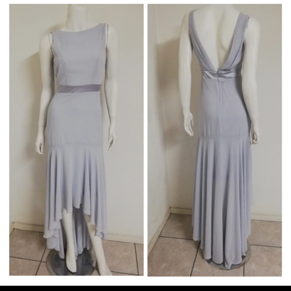 Galet snygg och smickrande balklänning i ljusg lila/grå/blå crepechiffong. Amvänd 1 gång