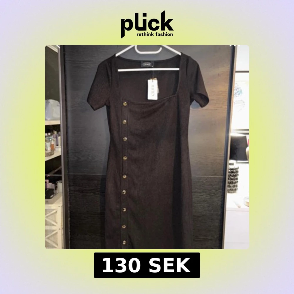 Snygg svart ribbad klänning från Cider med knappar längs sidan. Klänningen har korta ärmar och en fyrkantig halsringning. Perfekt för en stilren look.