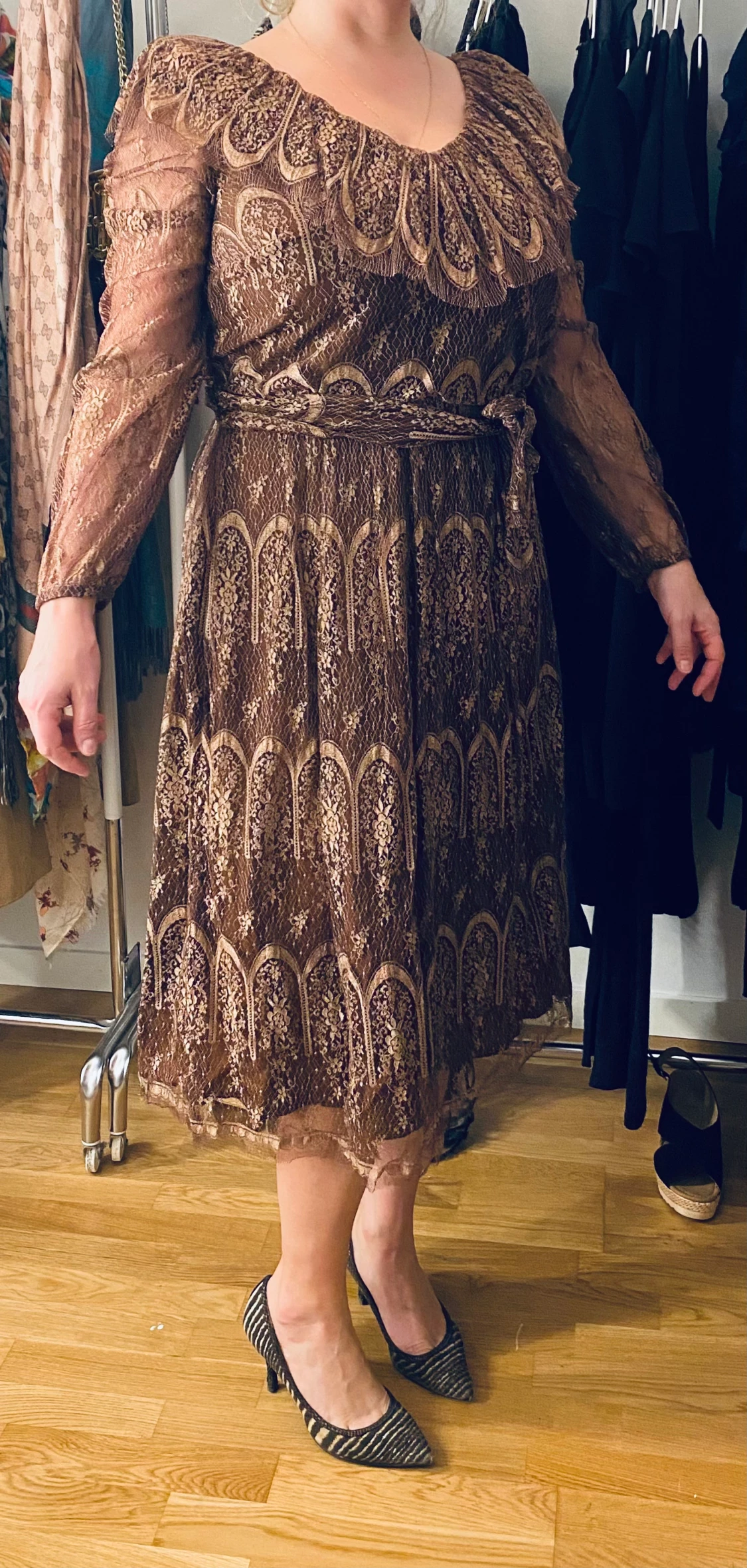 Ursnygg och classy klänning i spets. Moccabrun i färg. Sido dragkedja, spets skärp, vacker urringning. Längd till smalbenen. (Jag e 166cm)