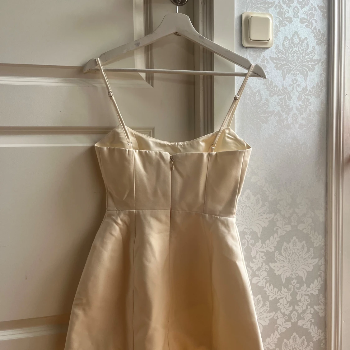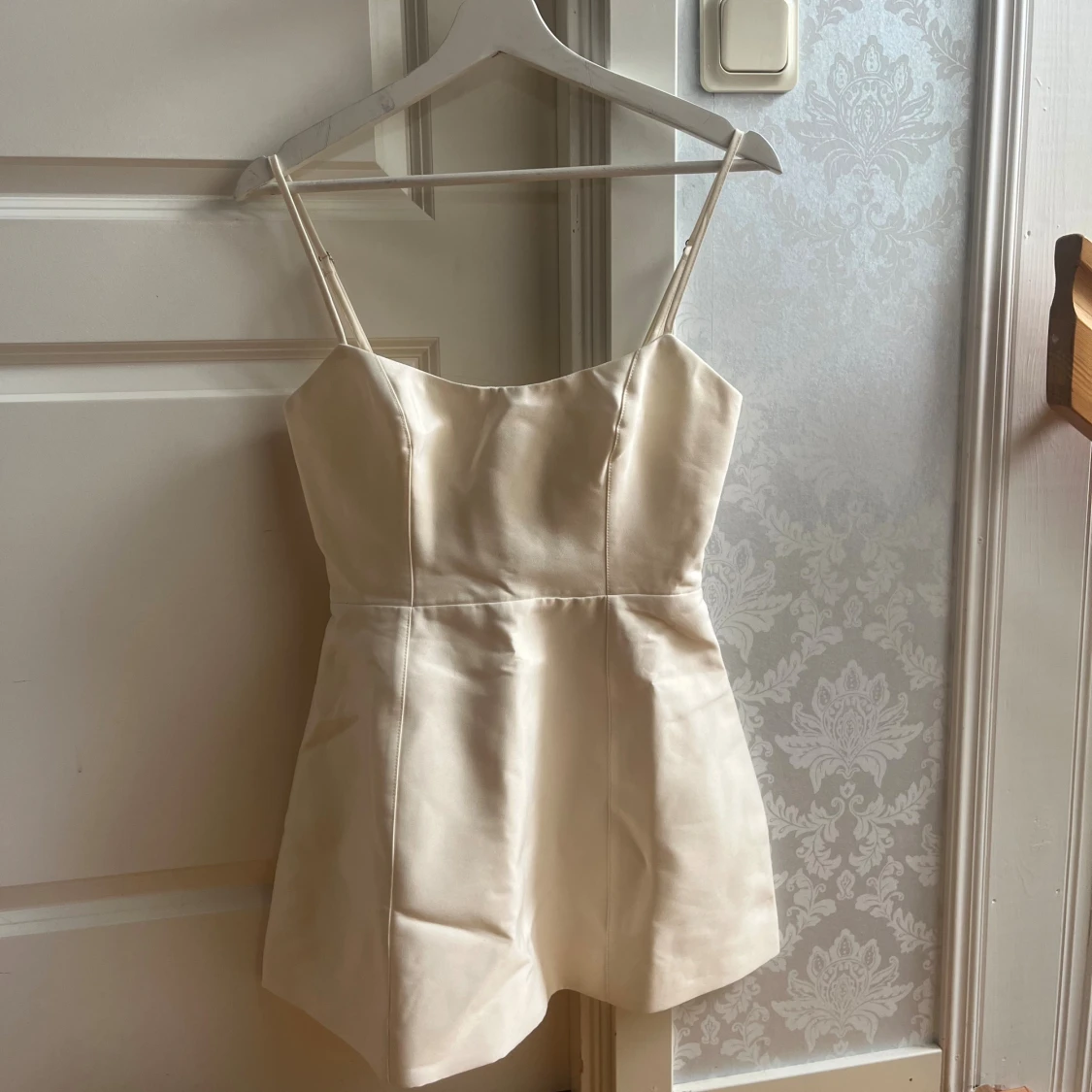 Supersöt vit miniklänning i satin med smala axelband och figurnära överdel. Klänningen har en lätt utsvängd kjol och stilren design som ger en chic och fräsch look. Perfekt för dig som vill sticka ut med en enkel men elegant stil. Perfekt inför studenten 💓💓💓 helt ny, nypris ca 900