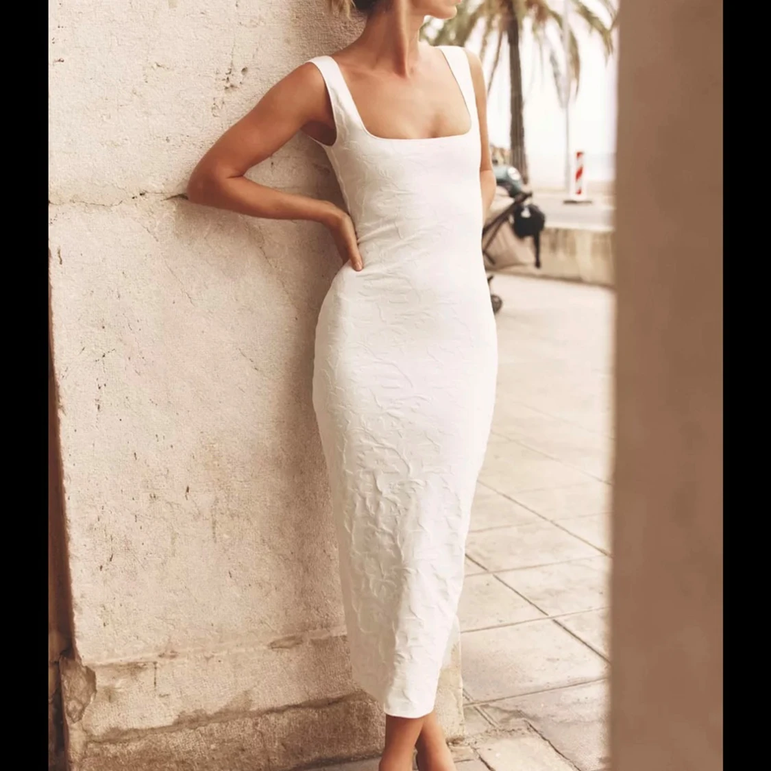 Supersnygg vit långklänning med breda axelband och fyrkantig ringning. Klänningen har en figurnära passform och ett subtilt mönster i tyget som ger en lyxig känsla. Perfekt för sommarens alla tillfällen!
