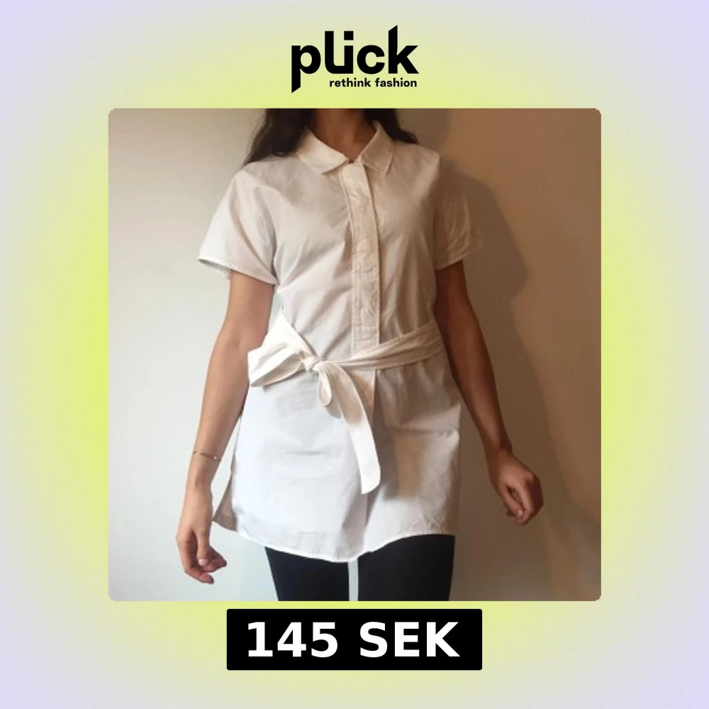 Vit kort skjortklänning med klassisk krage och korta ärmar. Klänningen har ett snyggt knytband i midjan. 100% bomull. I storlek M, men modellen på bilden har storlek S.