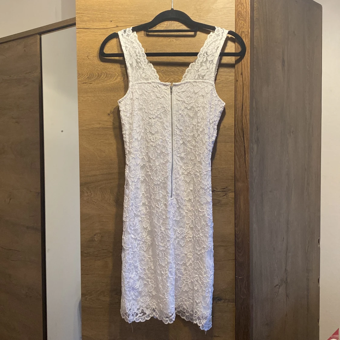 Supersöt vit kortklänning från Cubus i storlek 36. Klänningen är ärmlös med v-ringning och täckt av vacker spets. Den har dragkedja i ryggen och en figurnära passform som framhäver siluetten. Perfekt för dig som vill ha en romantisk look!