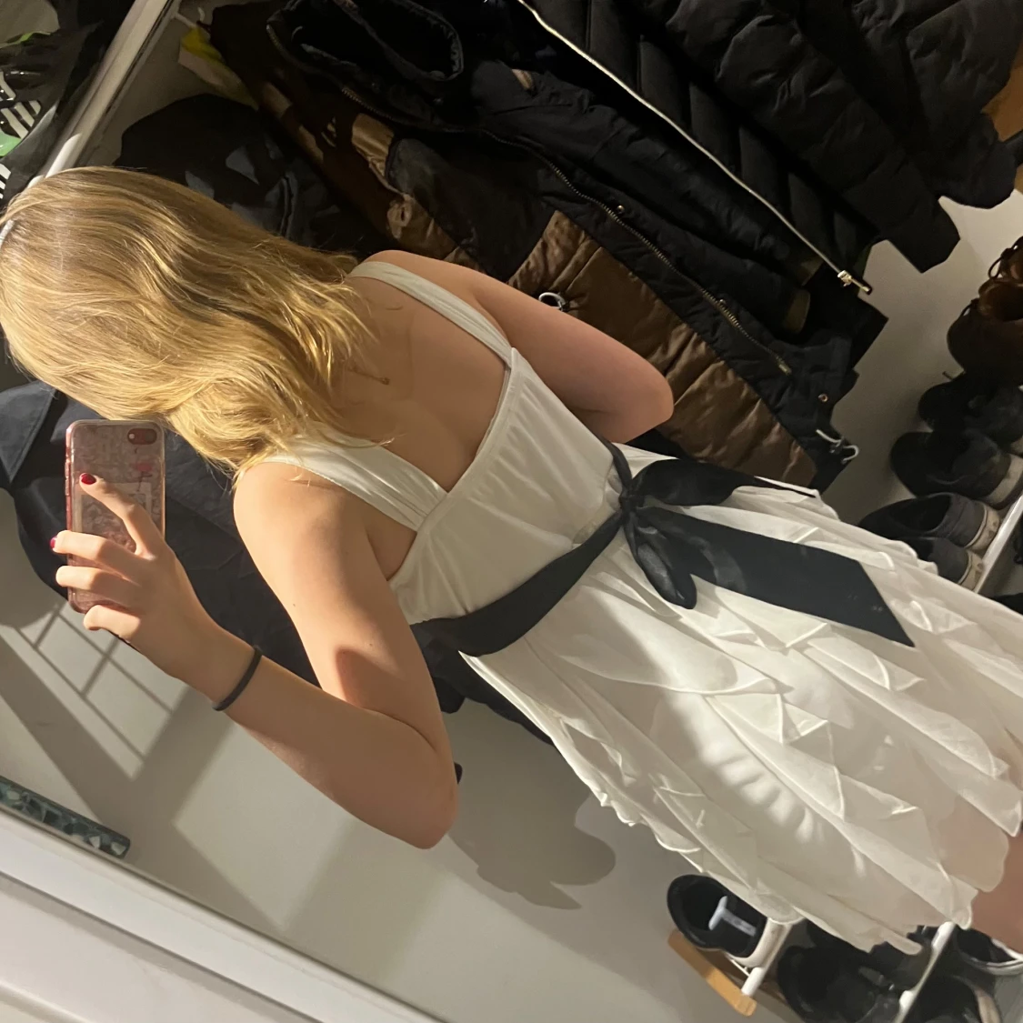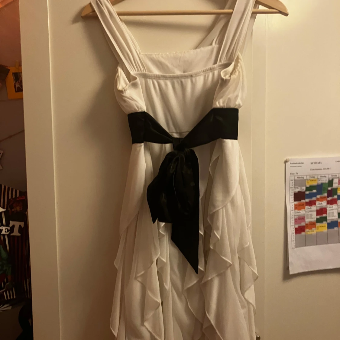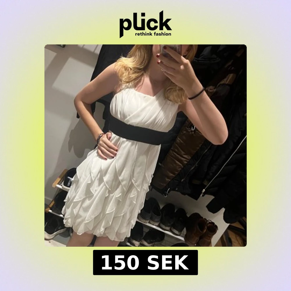 Elegant vit klänning med ett svart band i midjan och en dekorativ rosett baktill. Klänningen har en omlott-design med volanger och är ärmlös, vilket ger en luftig och stilren look.