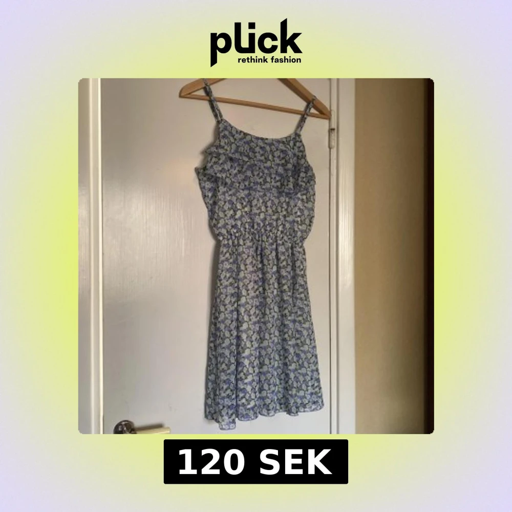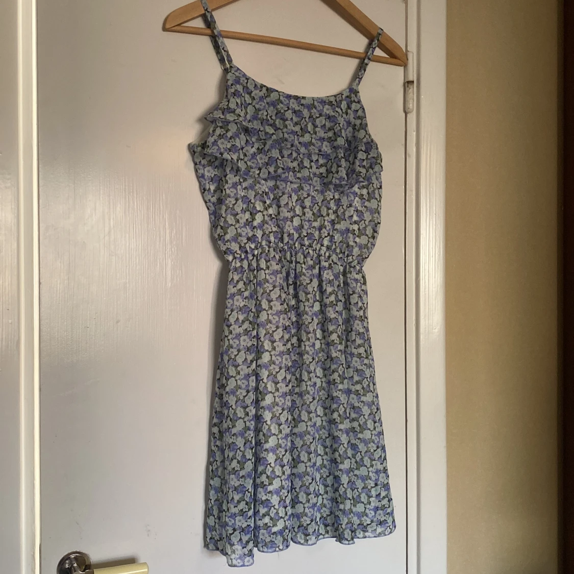 Söt ljusblå klänning med blommigt mönster och volangdetalj upptill. Axelbandslös modell med avslappnad passform🌼Strl 164