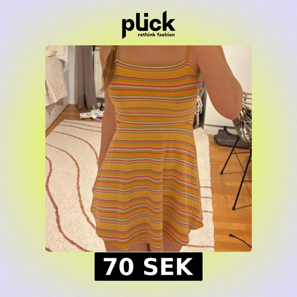 Superfin kort klänning med smala axelband som knyts. Klänningen har färgglada ränder i gult, orange, rosa, grönt och vitt. Den är ribbad och har en lätt utsvängd kjol, perfekt för varma dagar. Materialet känns mjukt och stretchigt.