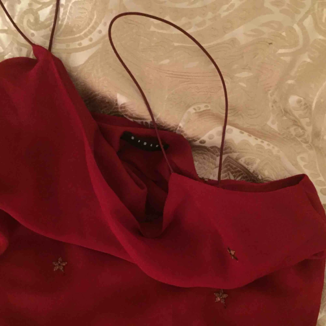 Röd klänning med tunna straps och broderade blommor i guld/brons. Står ingen storlek men skulle säga att den är S men är ganska kort. Möts upp eller skickar mot frakt