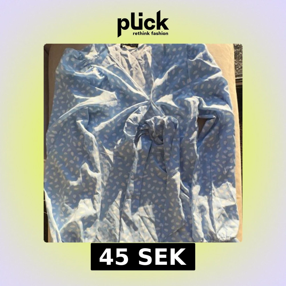 Säljer en söt blå klänning med vita prickar från Shein. Klänningen har en knytning framtill och långa ärmar. Perfekt för en somrig look!