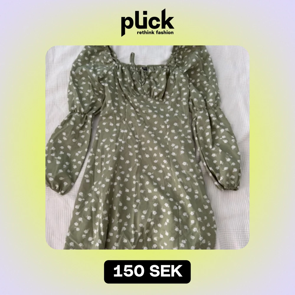 Säljer en superfin grön klänning från Shein med ett sött vitt blommönster. Klänningen har långa ärmar och en söt knytning vid halsen. Använd några få gånger.