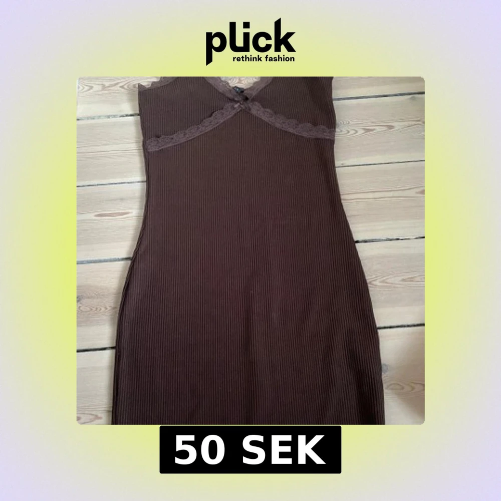 Säljer en brun ribbad klänning från H&M Divided med spetsdetaljer och en liten rosett framtill!