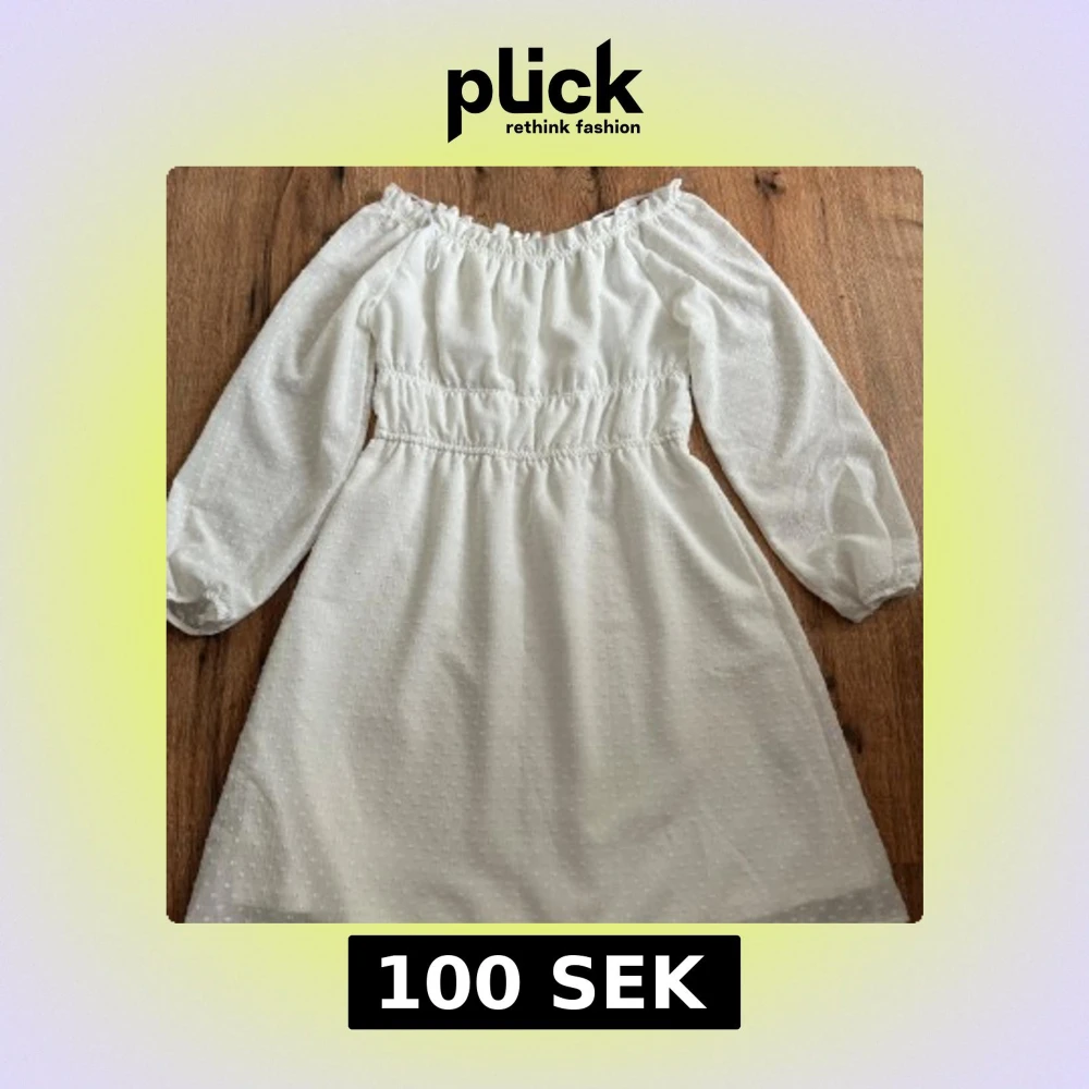 Säljer en söt vit klänning från H&M med elastisk offshoulder-design och långa ärmar. Klänningen har ett diskret prickigt mönster och smockdetaljer i midjan för en fin passform. Perfekt för sommarens alla tillfällen! 🌼