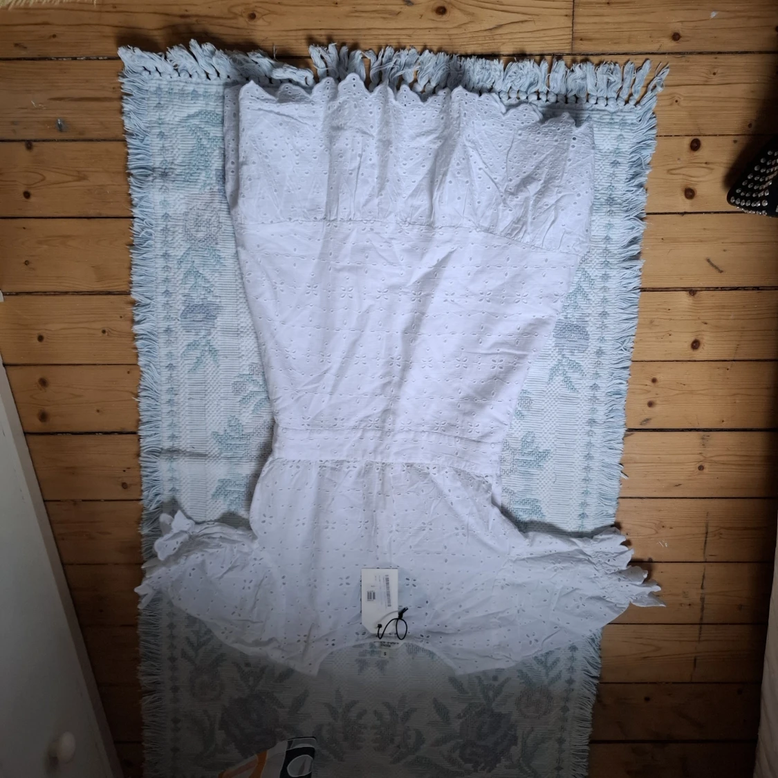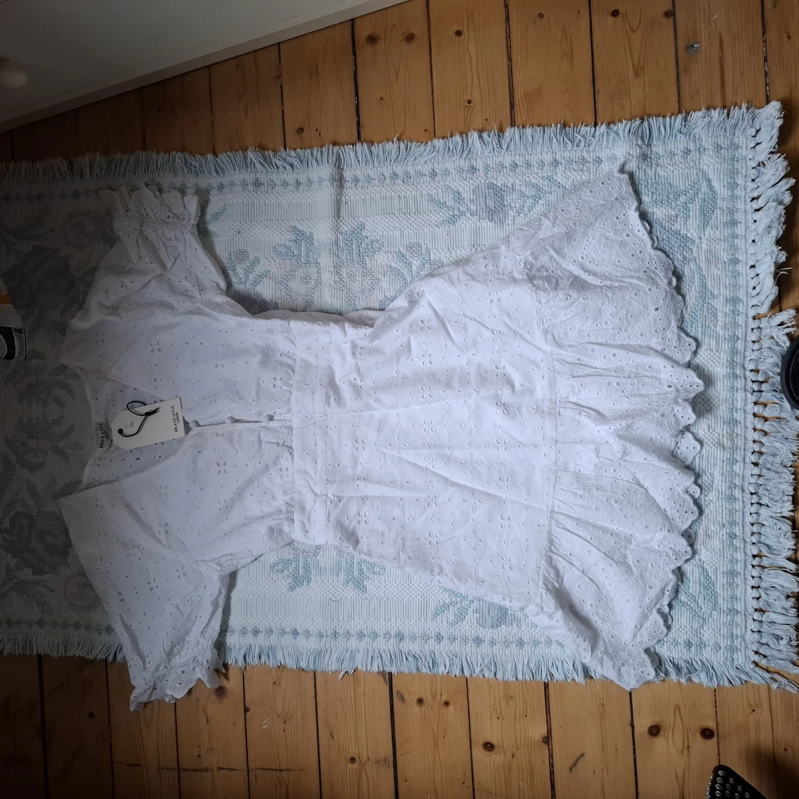 Superfin vit kortklänning från Sisters Point med broderade detaljer och volangkant. Klänningen har v-ringning och korta ärmar, perfekt för sommarens alla tillfällen. Söt och feminin modell med markerad midja.