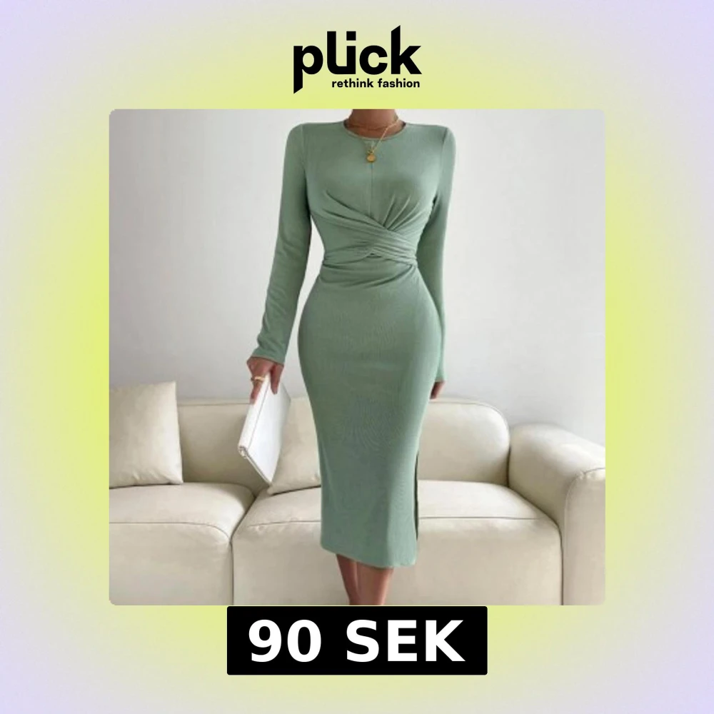 Elegant grön långklänning med långärmad design och knyt i midjan. Klänningen har en smickrande omlott-detalj framtill och en slits på sidan för extra stil. Perfekt för en chic look.