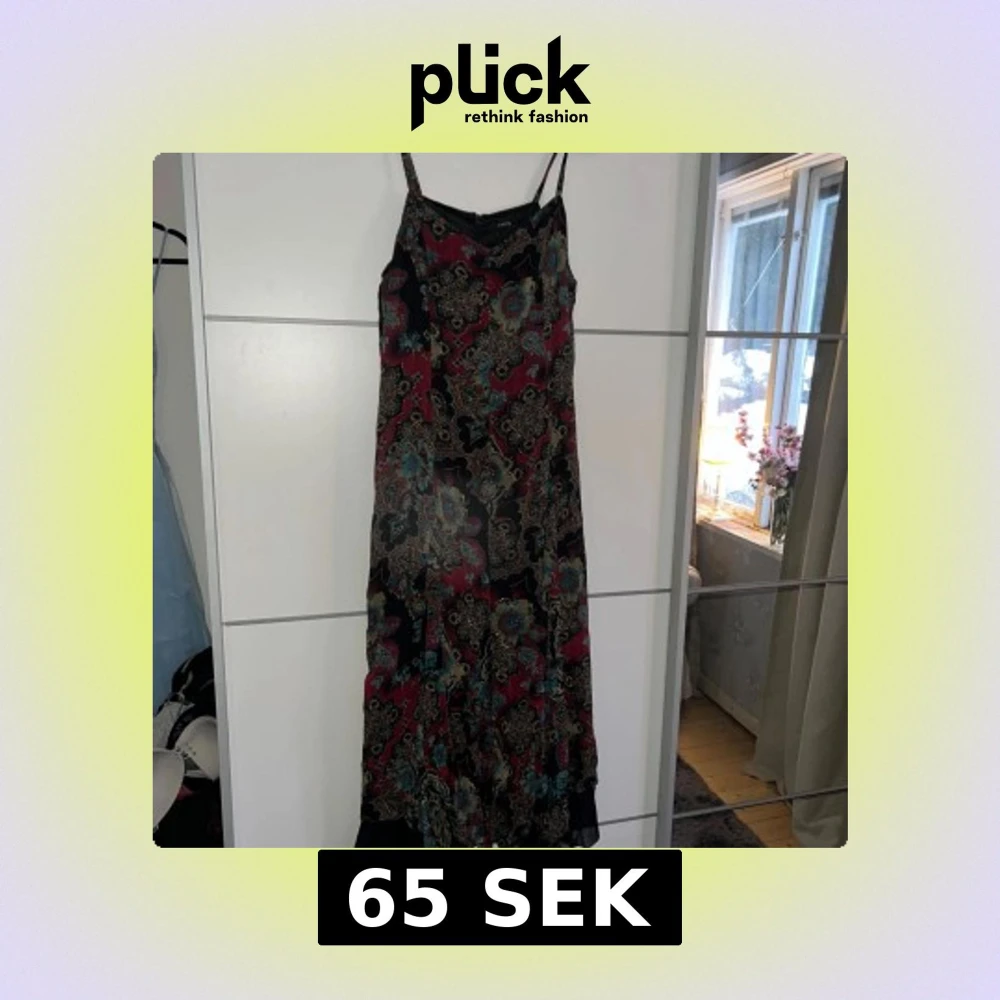 Säljer en färgglad långklänning från b.young med ett unikt mönster i rött, blått och svart. Klänningen har smala axelband och en elegant passform som passar perfekt för speciella tillfällen. Den har en dragkedja i sidan för enkel påklädning.