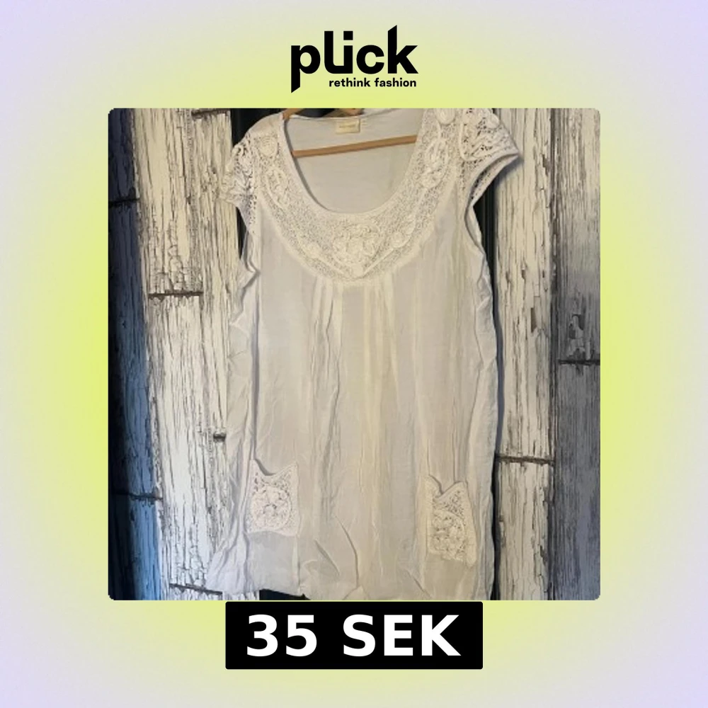 Säljer en vit klänning från Marc Lauge med vackra spetsdetaljer vid halsringningen och på axlarna. Klänningen har korta ärmar och en lös passform, perfekt för en avslappnad stil. Den är tillverkad i ett lätt och luftigt material.