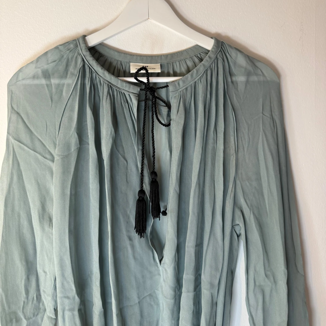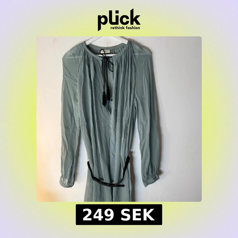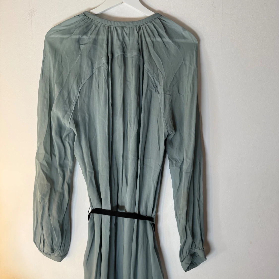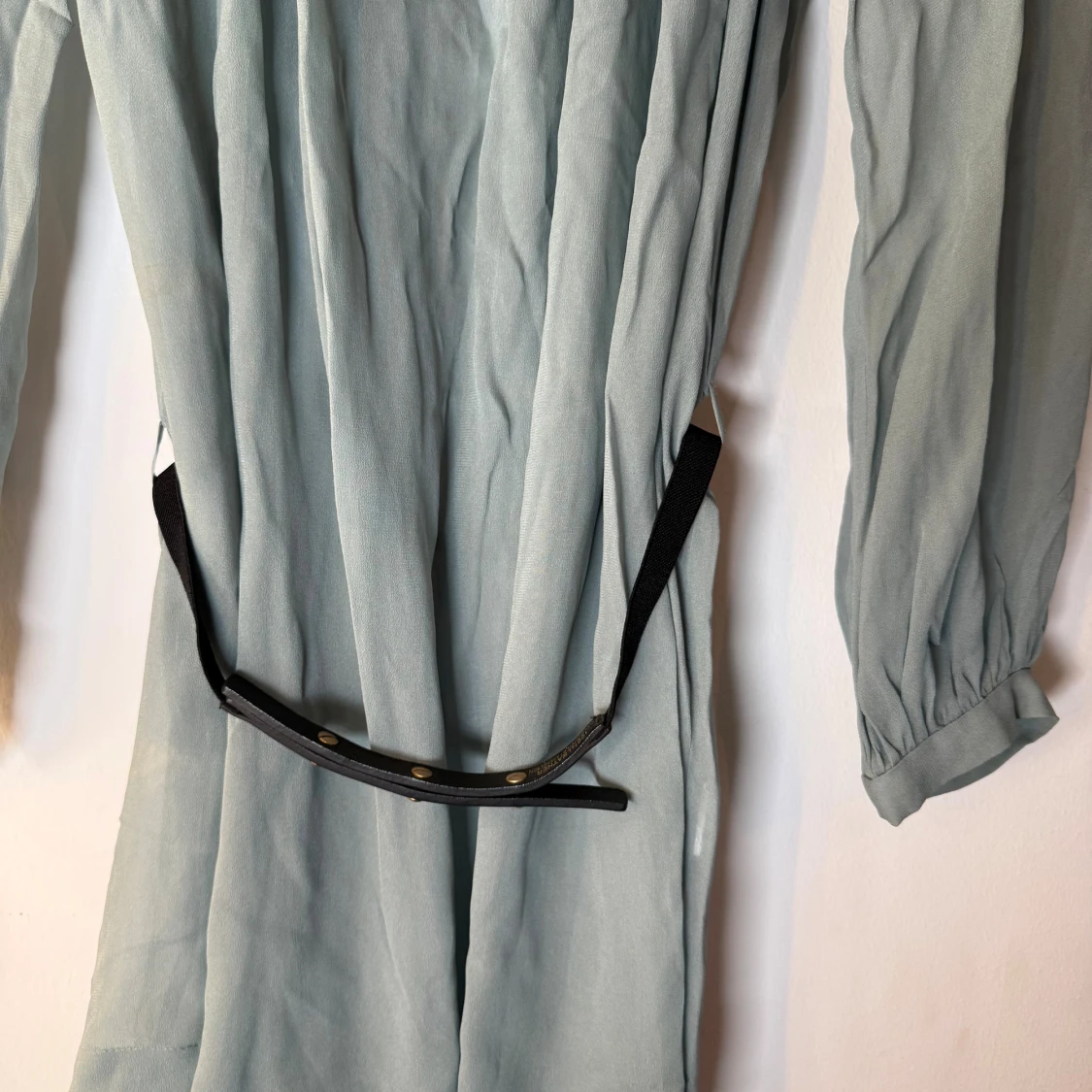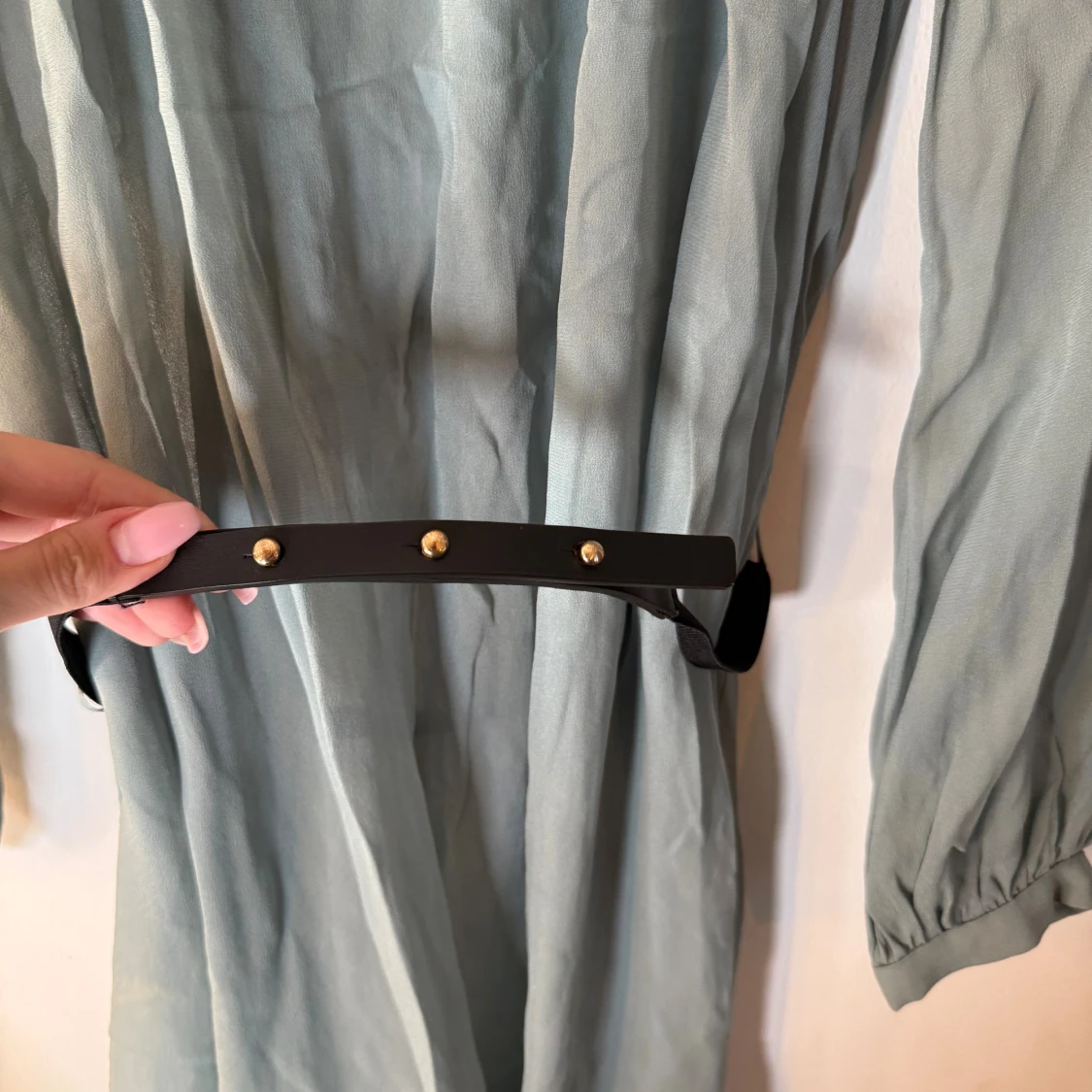 Ljusblå klänning/lång blus med långa ärmar och ett svart läderbälte med guldfärgade detaljer. Klänningen har en knytdetalj med tofsar vid halsen. Storlek L. Lite genomskinlig.