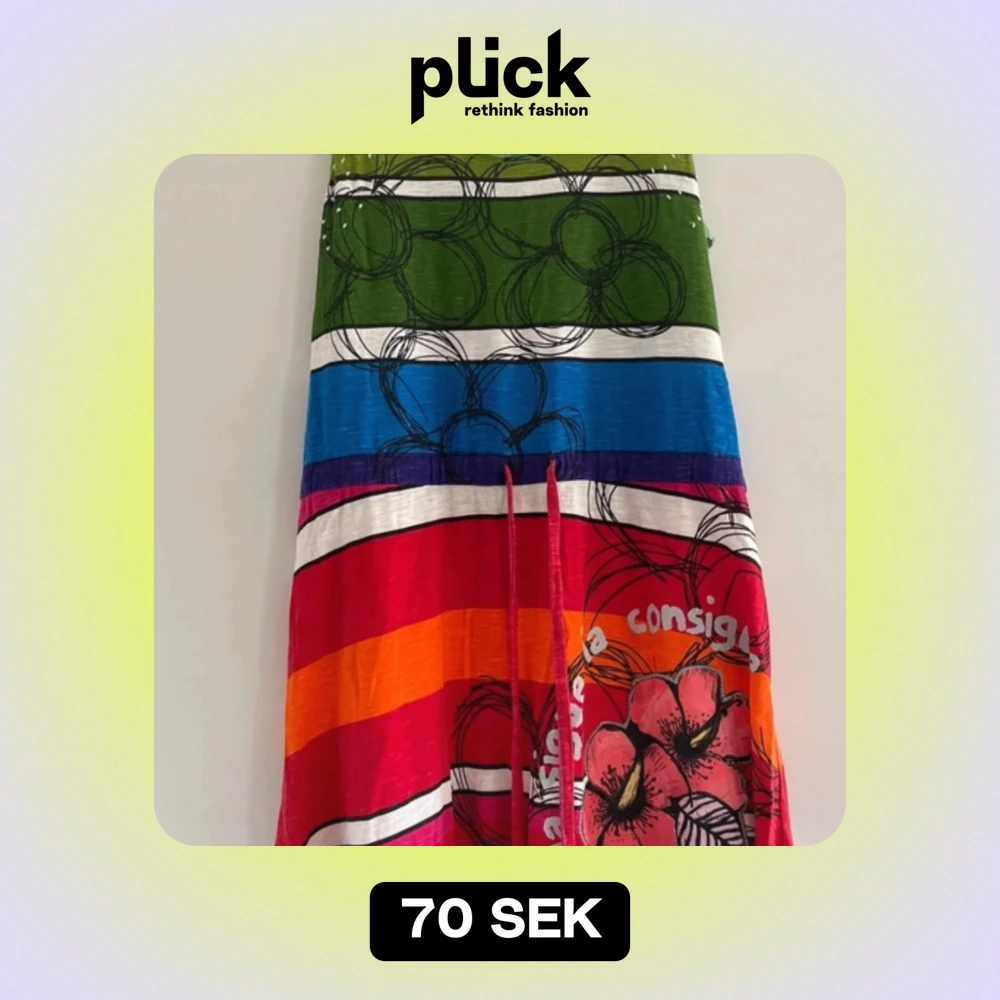 Säljer en superfin och färgglad klänning från Desigual i storlek CHILD L. Klänningen har ett unikt mönster med ränder i grönt, blått, rött och orange samt blommor. Perfekt för sommaren med sin lätta och luftiga stil. Den har en normal passform och är i mycket bra skick.