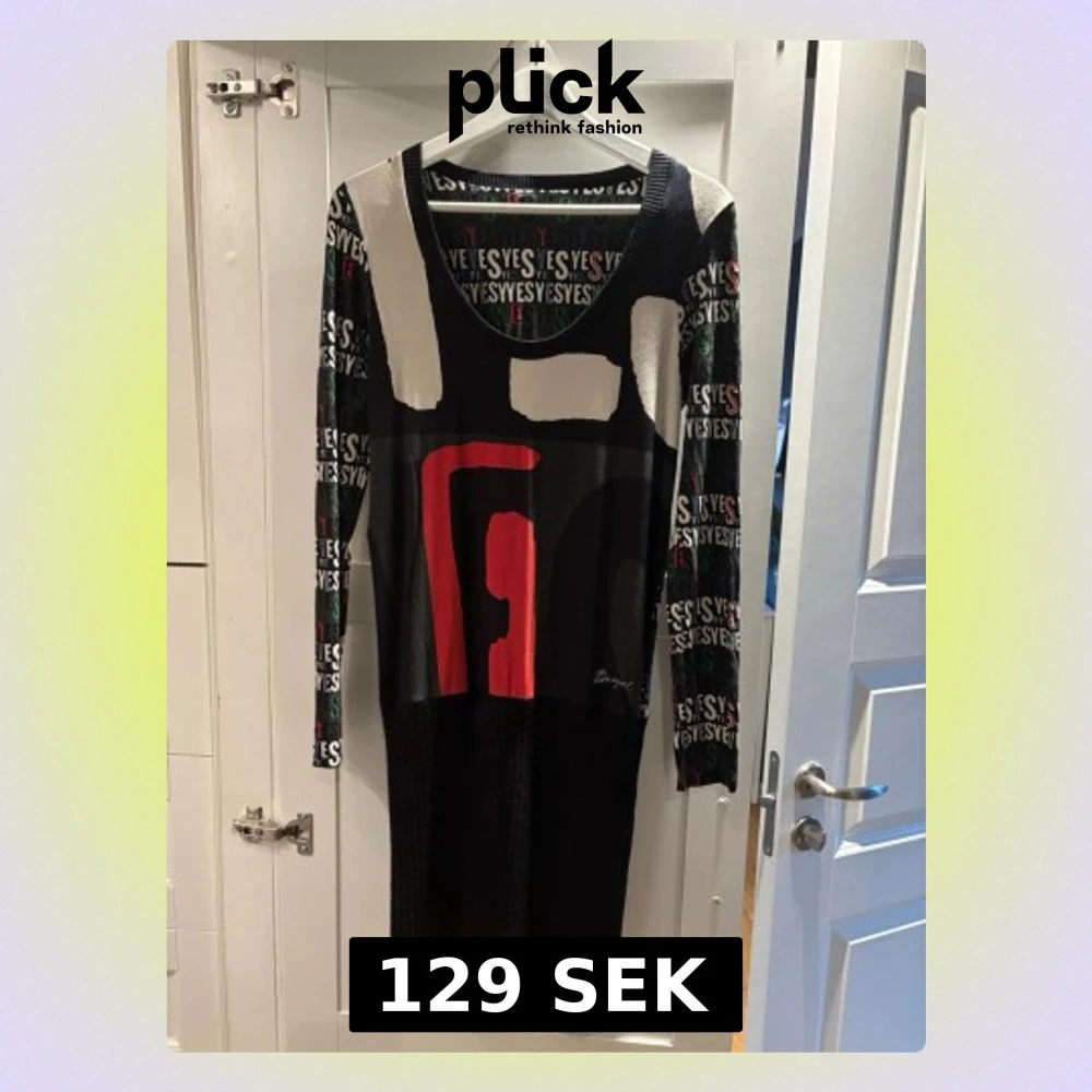 Cool långärmad klänning från Desigual med grafiskt mönster i svart, rött, vitt och grönt. Klänningen har texten 'YES' tryckt över hela ärmarna och en stor röd detalj framtill. Materialet är mjukt och stretchigt, perfekt för dig som gillar unika prints och färgkombinationer. Nedre delen är stickad.