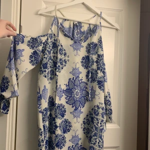 Sval sommarklänning med vackert mönster. Vit och blå färg. 🤍💙 Storlek S. Från DM Retro. Har ärmar men det är ett ”cut” vid axlarna så axlarna blir bara när man bär klänningen vilket är väldigt fint. 🥰 Går att knyta vid halsen med (se bild) om man vill. 👌🏼 Frakt tillkommer. 🤍