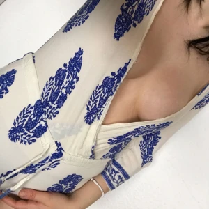 Jumpsuit från DM Retro, säljes pga väldigt mycket för liten. Liten i storleken, finns knapp vid urringningen för att ”stänga” den. Krämvit med blått mönster! Använd en gång. Frakt 45:- eller möte i jkpg/habo