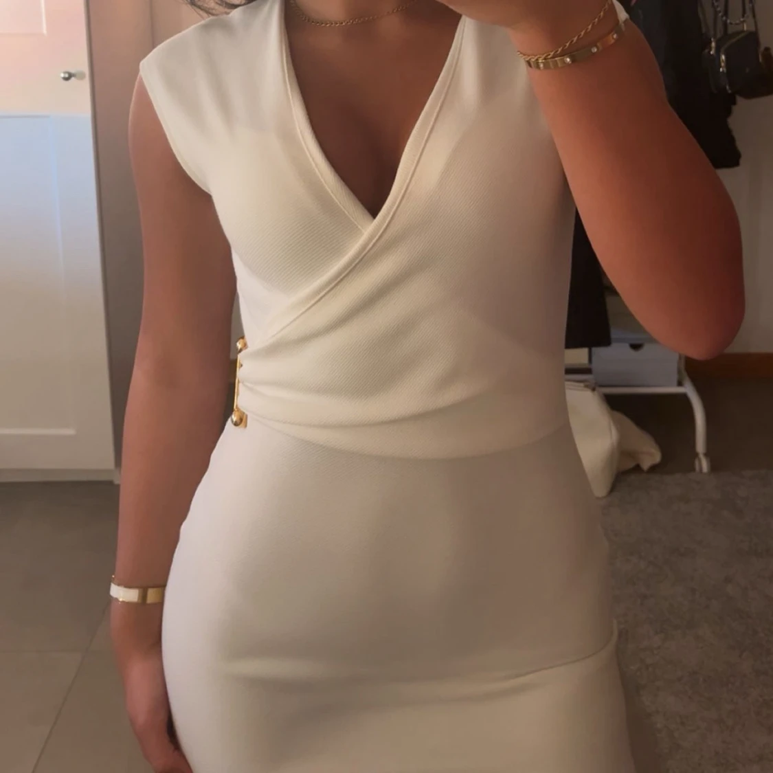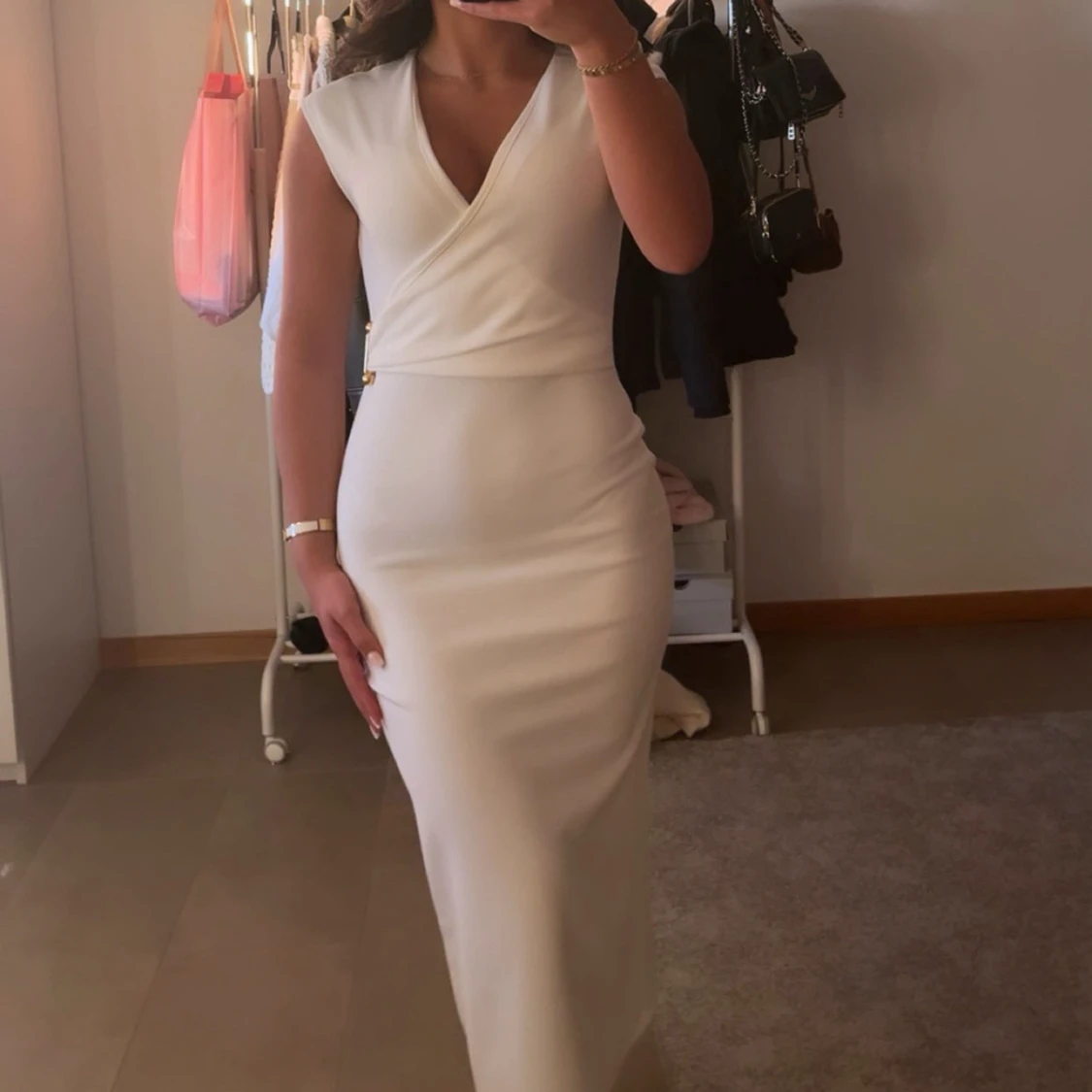 Snygg vit långklänning med omlott-design och v-ringad hals. Klänningen har en figurnära passform och är ärmlös, vilket ger en stilren och modern look. Materialet är mjukt och stretchigt, perfekt för dig som gillar att klä dig elegant och trendigt. Endast använd 2 gånger