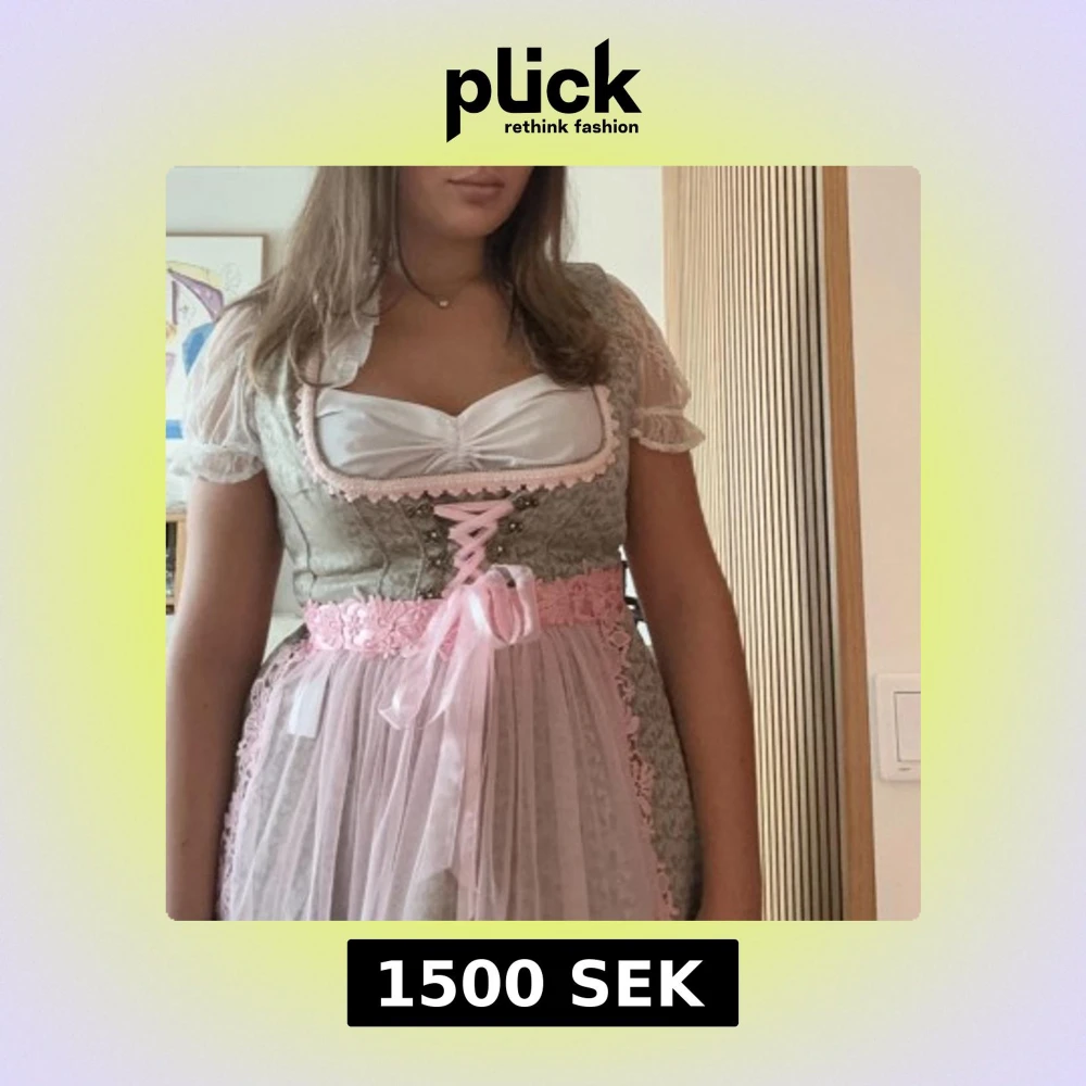 Säljer en dirndl i med diskret mönster, snörning framtill med rosa band och spets samt ett lager av rosa tyll. Tillhörande vit blus med spetsdetaljer från Selection Premium ingår. Perfekt för oktoberfest. Klänning i strl 42 och linne i storlek 44