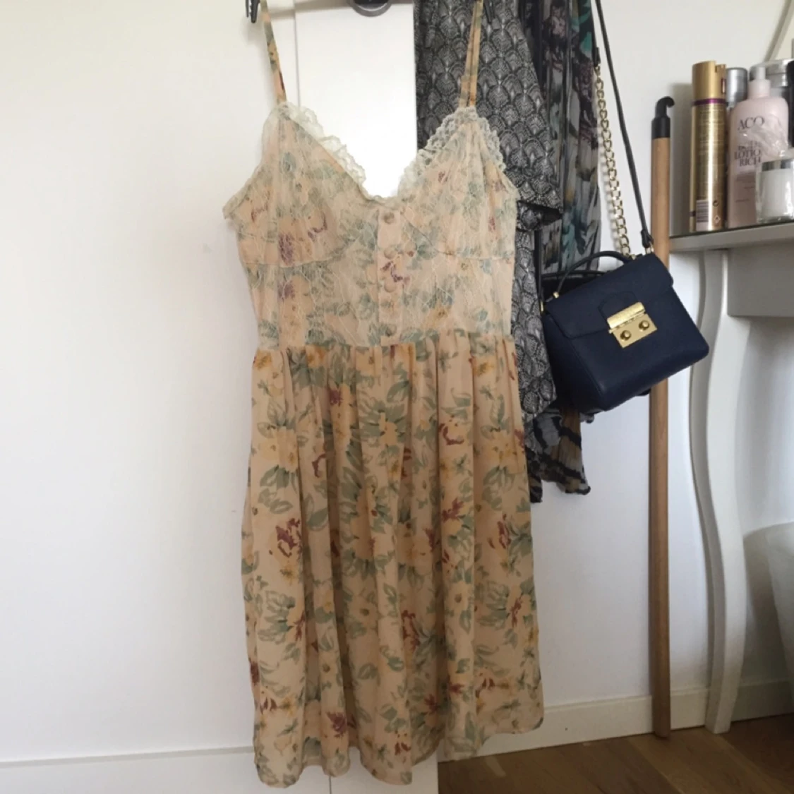 Vit spetsklänning med volangärmar - Superfin vit kortklänning i spets med blommigt mönster och volangiga axelband. Klänningen har en luftig och loose passform, perfekt för varma dagar. Söt och romantisk stil med v-ringning och detaljerade kanter. Ingen synlig dragkedja eller knappar.