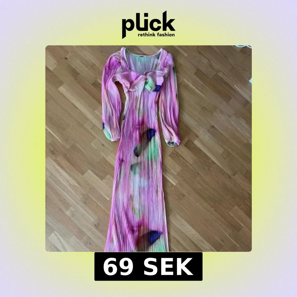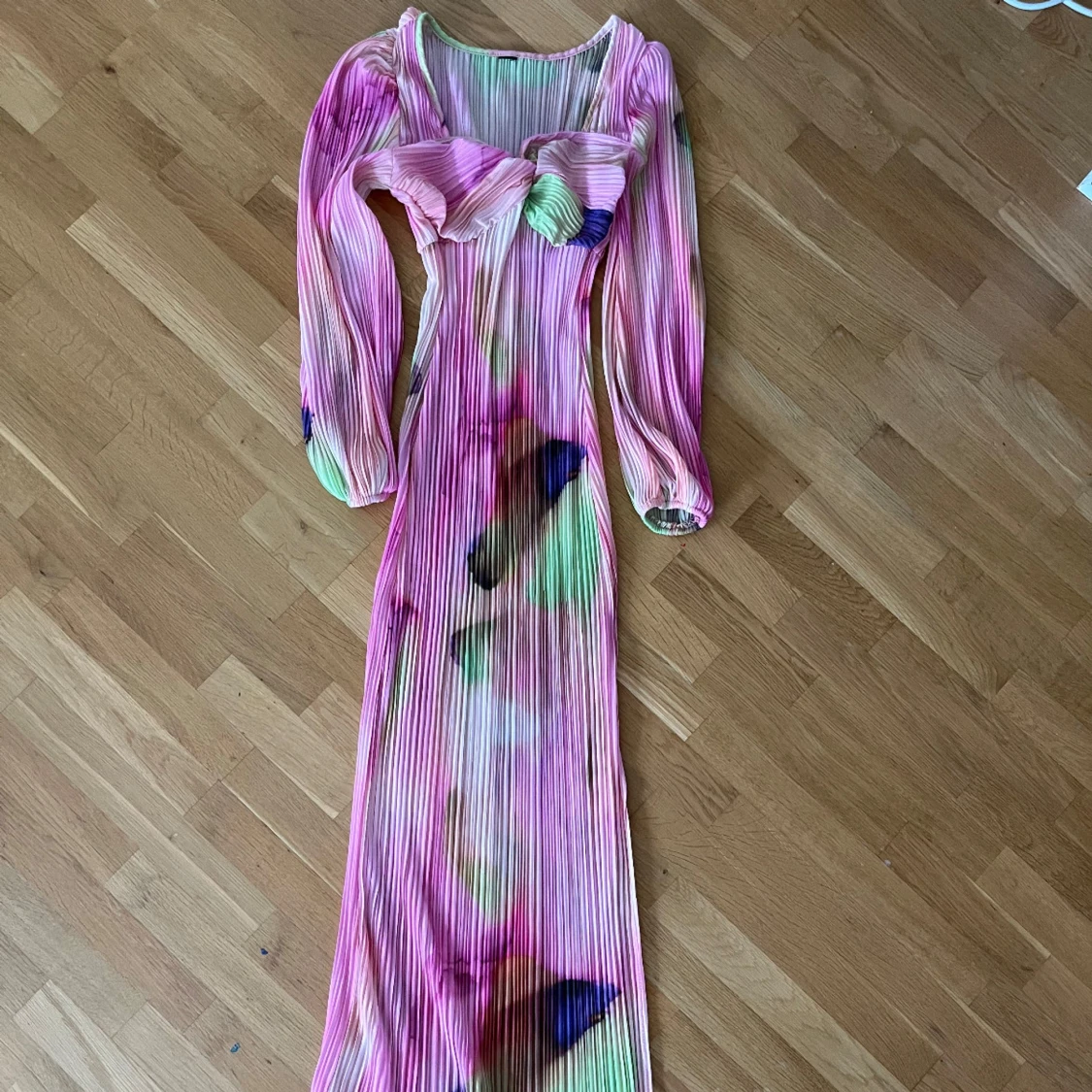 Säljer en unik långklänning med plisserat tyg i flera färger som rosa, grön, blå och lila.