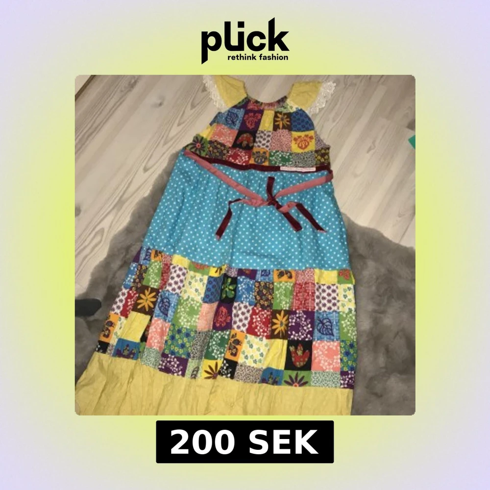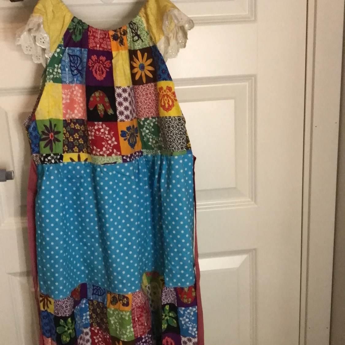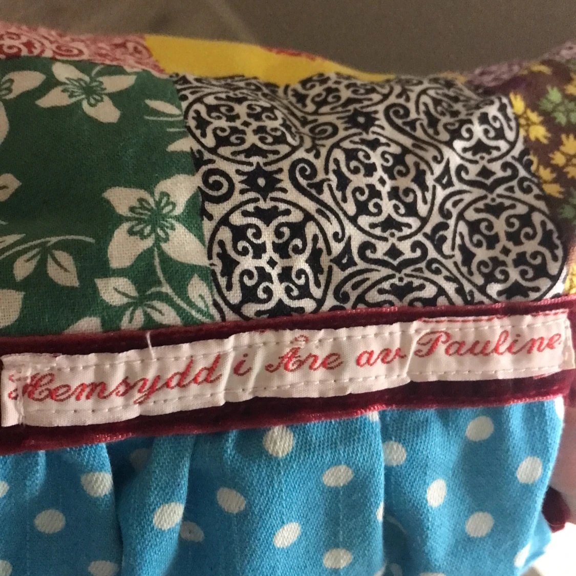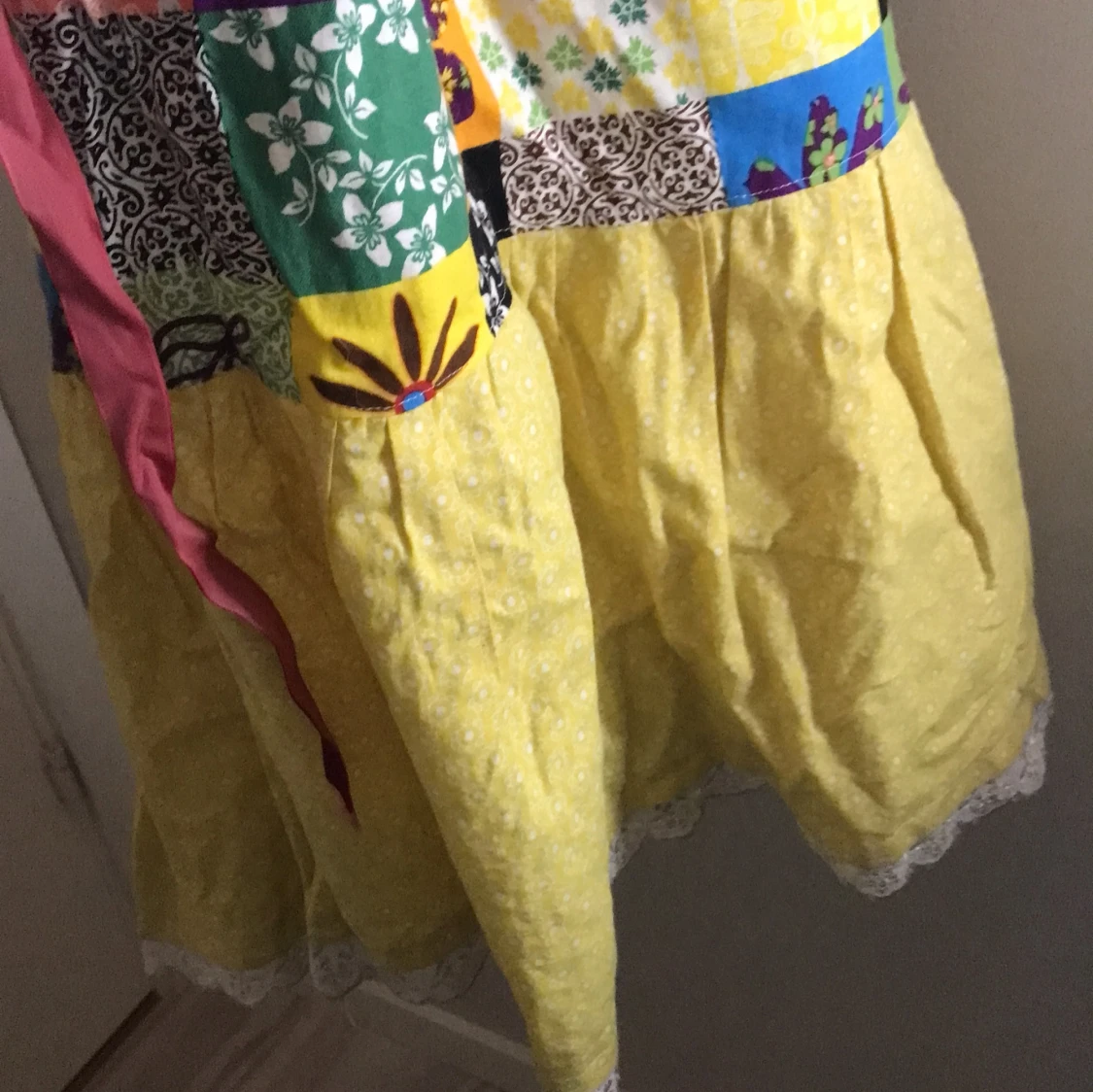 Unik och färgglad patchwork-klänning med ett lapptäcksmönster i olika färger och mönster. Klänningen har en mix av blommiga och prickiga mönster samt spetsdetaljer vid ärmarna. Den har en knytning i midjan och en härlig volangkant längst ner. Gjord i Åre. Hemsydd, så finns ju bara denna klänning.