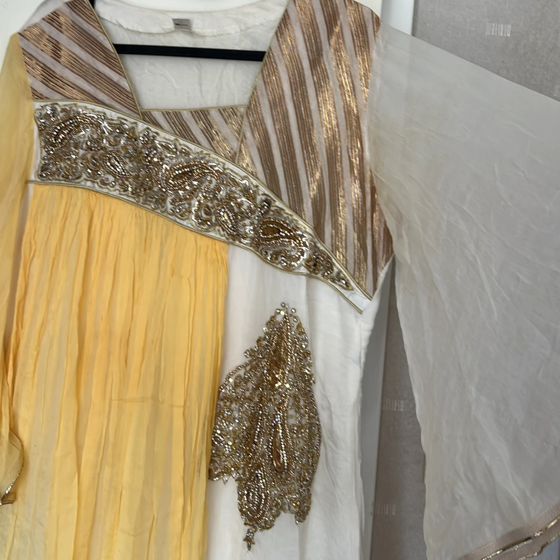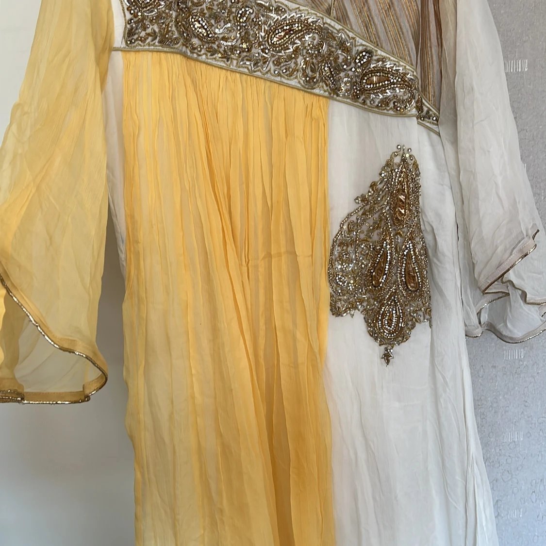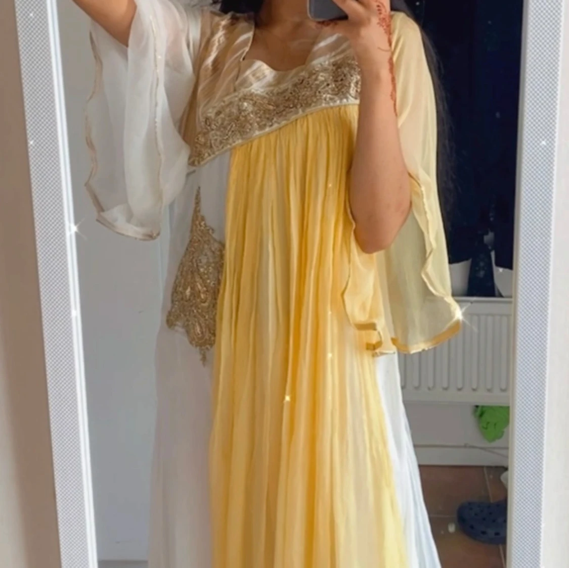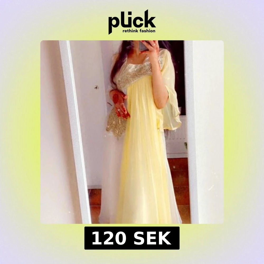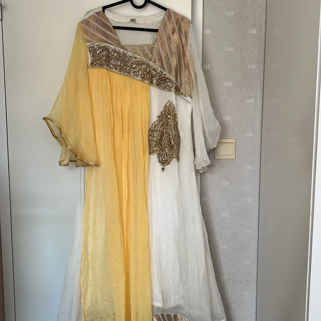 Långklänning i ljusgul och vit med breda ärmar. Klänningen har en flowy passform och är tillverkad i ett tunt, lätt material som ger en elegant look. Klänningen är i storlek L men passar lika bra för S och M, jag som har storlek S passade den mig perfekt.
